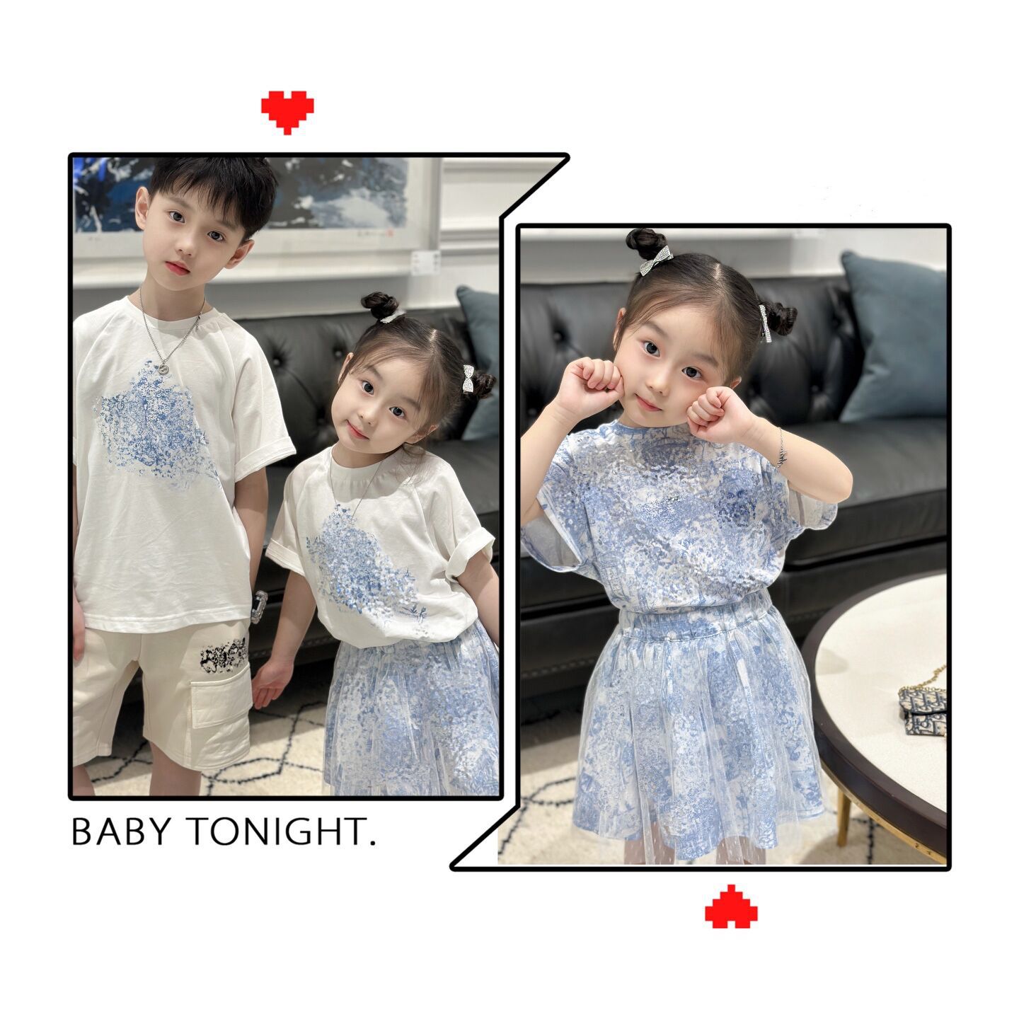 现货 春夏女童T恤套装 蓝色满印T恤+蓝色满印附纱半裙 小公主