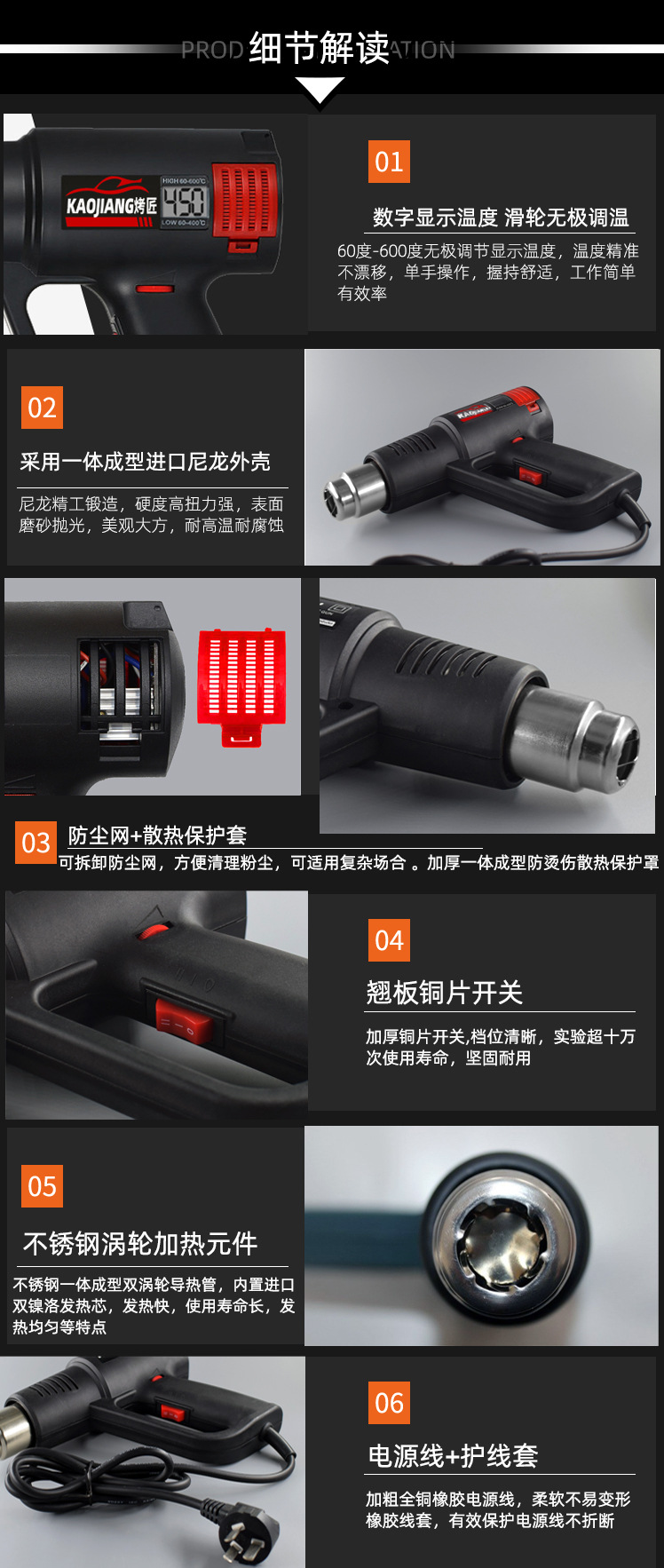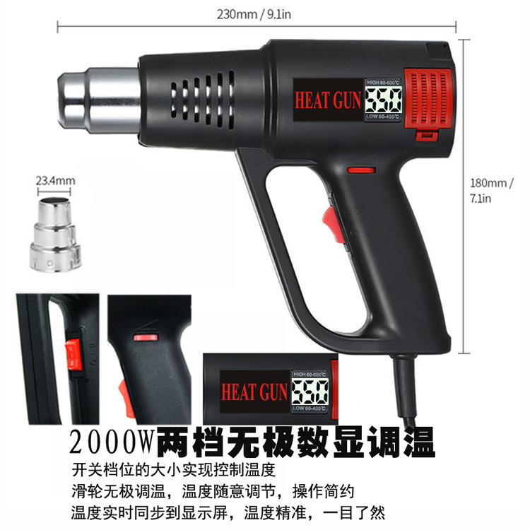 极简设计小型热风枪2000大功率可调温数显双档风速风筒烤枪