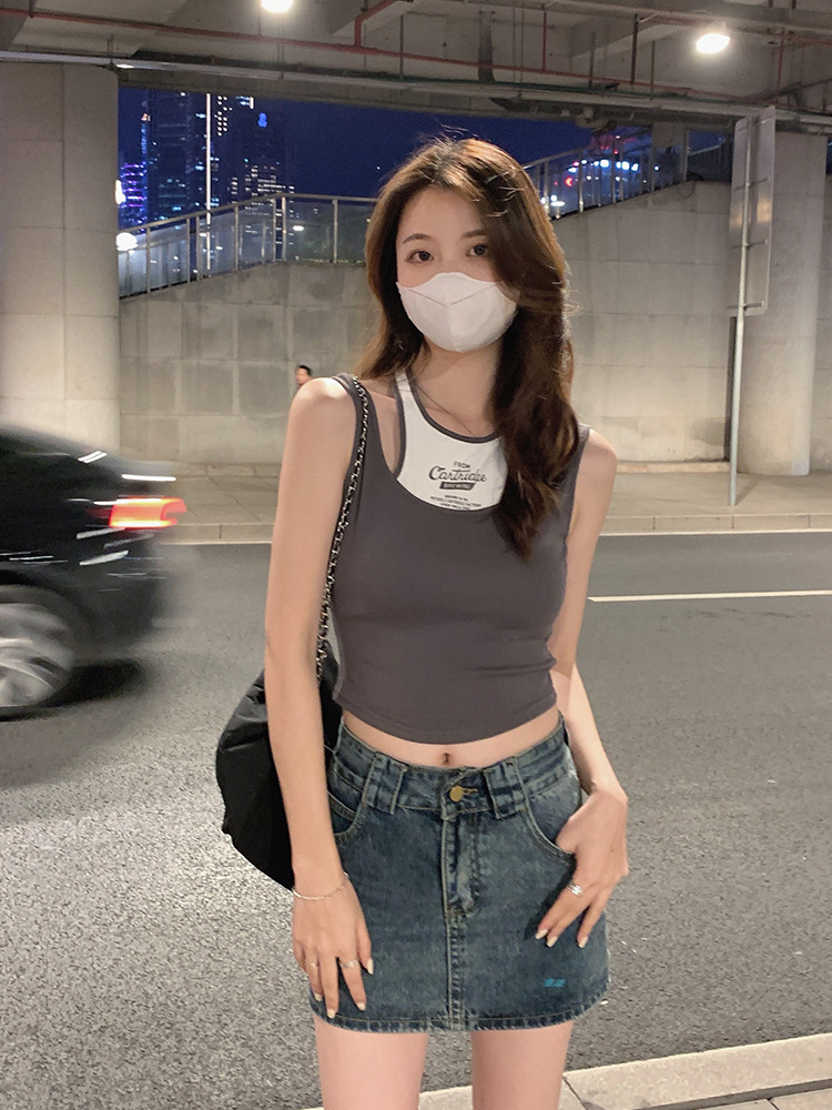 欧美复古辣妹撞色假两件无袖内搭上衣女夏修身显瘦短款露脐打底衫
