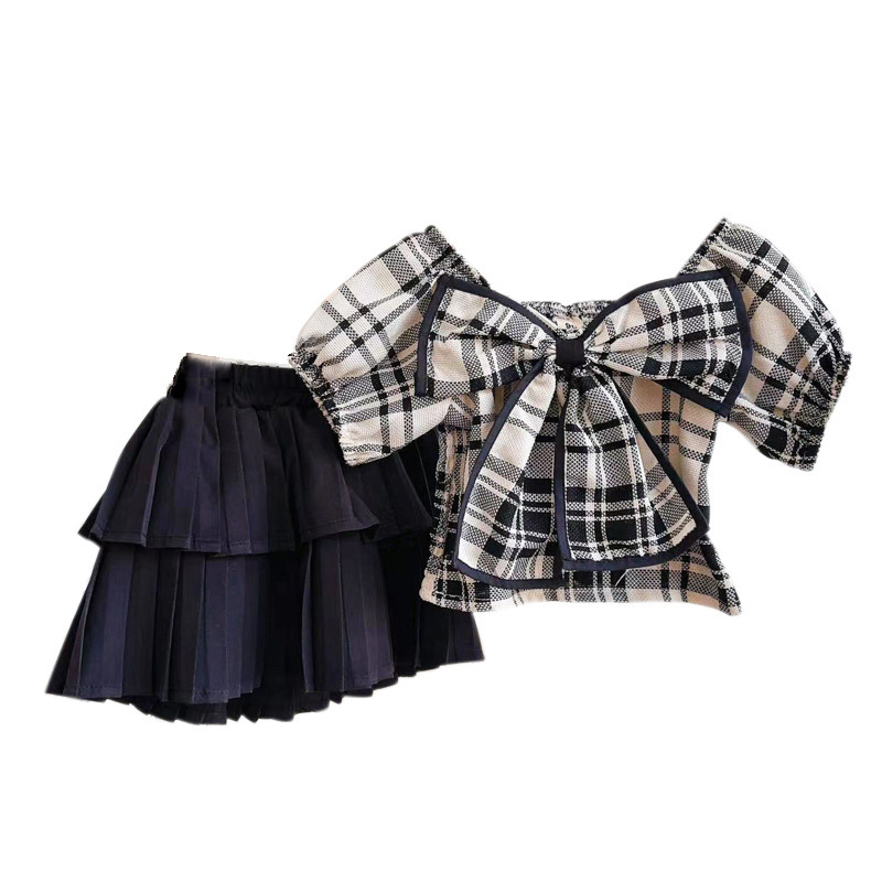 女童网红套装夏季新款儿童2025洋气时髦蝴蝶结格子裙裤两件套