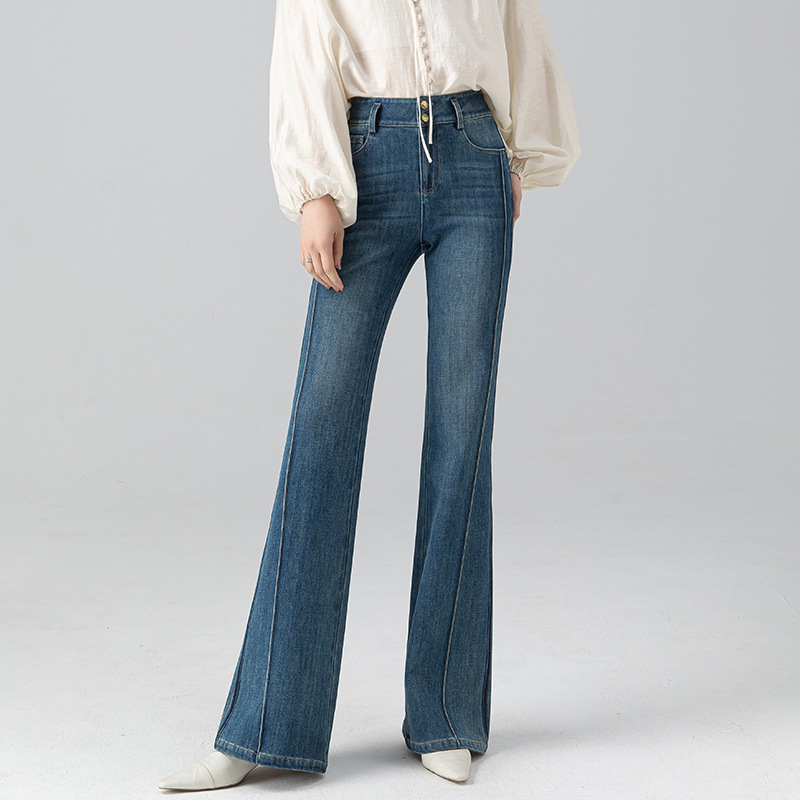 弹力梨形身材显瘦裤子女秋季2025新款高腰双排扣微喇牛仔裤