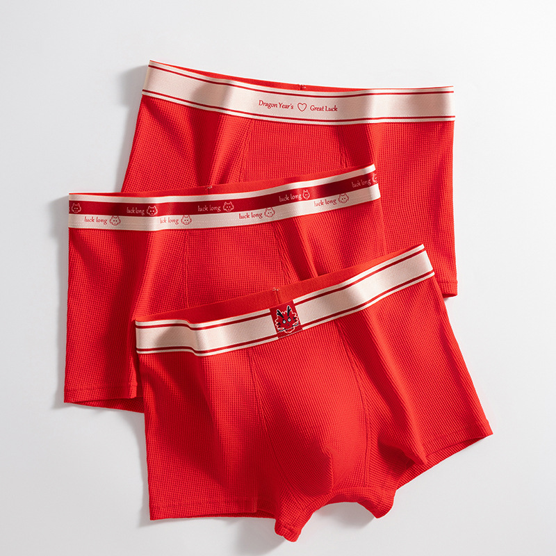 新款华夫格莫代尔棉大红平角裤男本命年潮流男士内裤