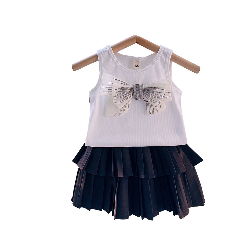 新品女童2025背心套装夏季新款时尚大蝴蝶结背心花边百褶裙两件套