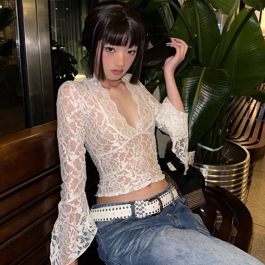 新款性感V领透视白色蕾丝喇叭袖修身显瘦蕾丝衫长袖上衣女