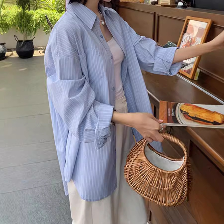 高级感蓝色条纹衬衫女韩系早秋新品宽松长袖衬衣设计感小众上衣