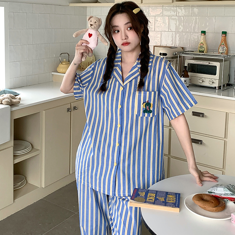 纯棉ins风休闲短袖家居服两件套大象蓝黄条纹翻领开衫睡衣可外穿