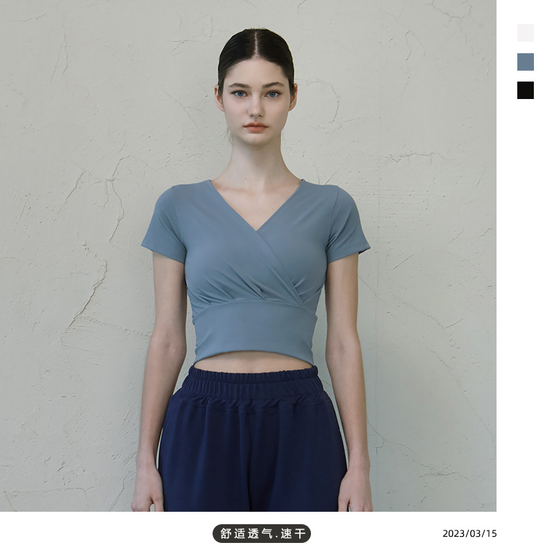 春夏lulu修身性感V领交叉瑜伽服贴身透气速干短袖运动上衣女