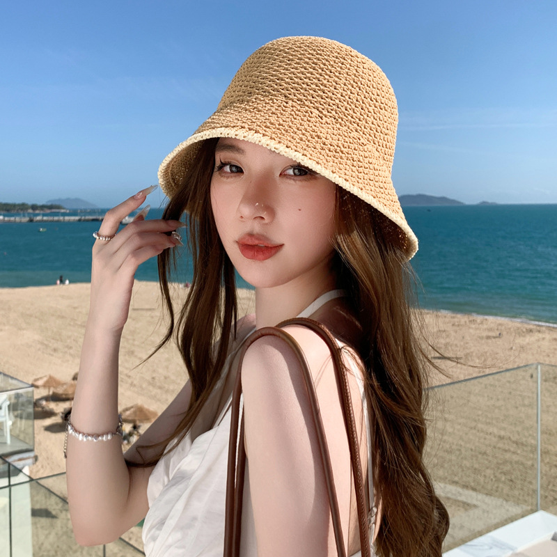 新款春夏渔夫帽遮阳防晒帽草编针织镂空圆顶水桶帽百搭可折叠盆帽