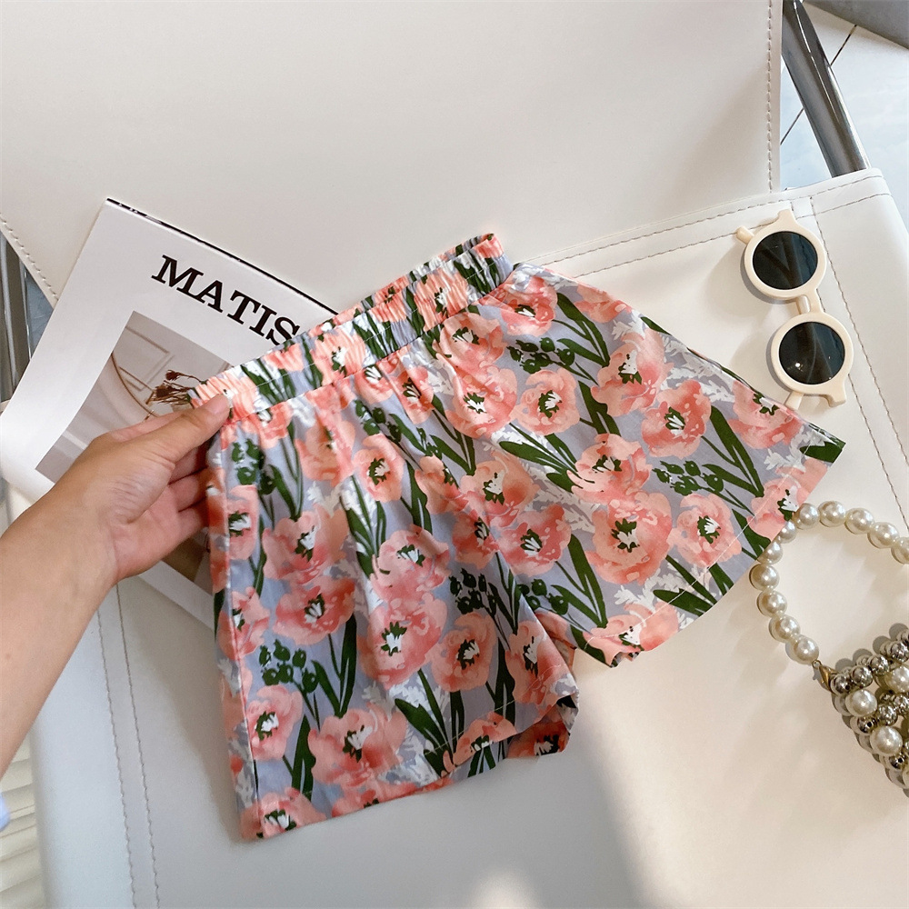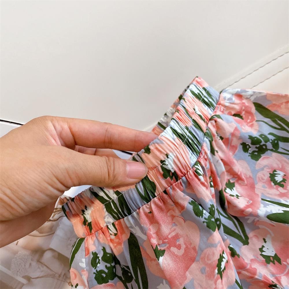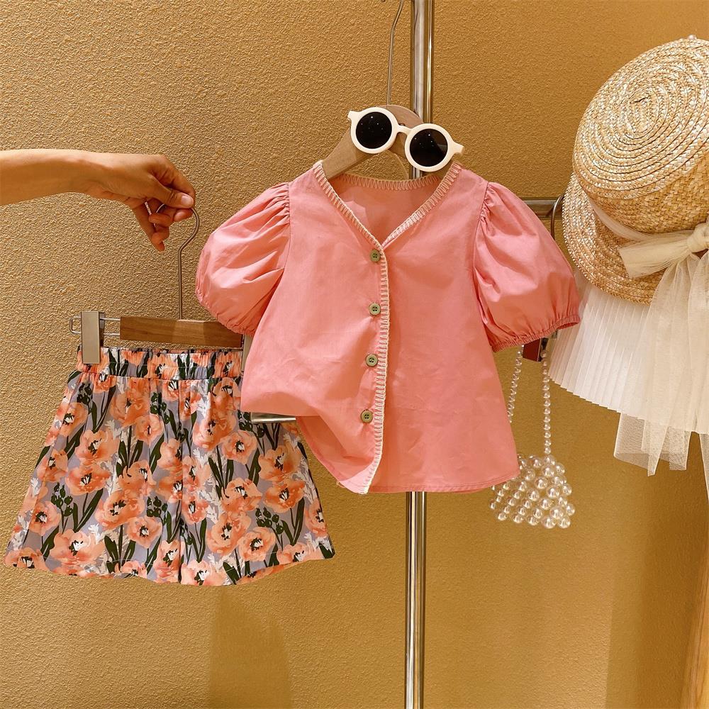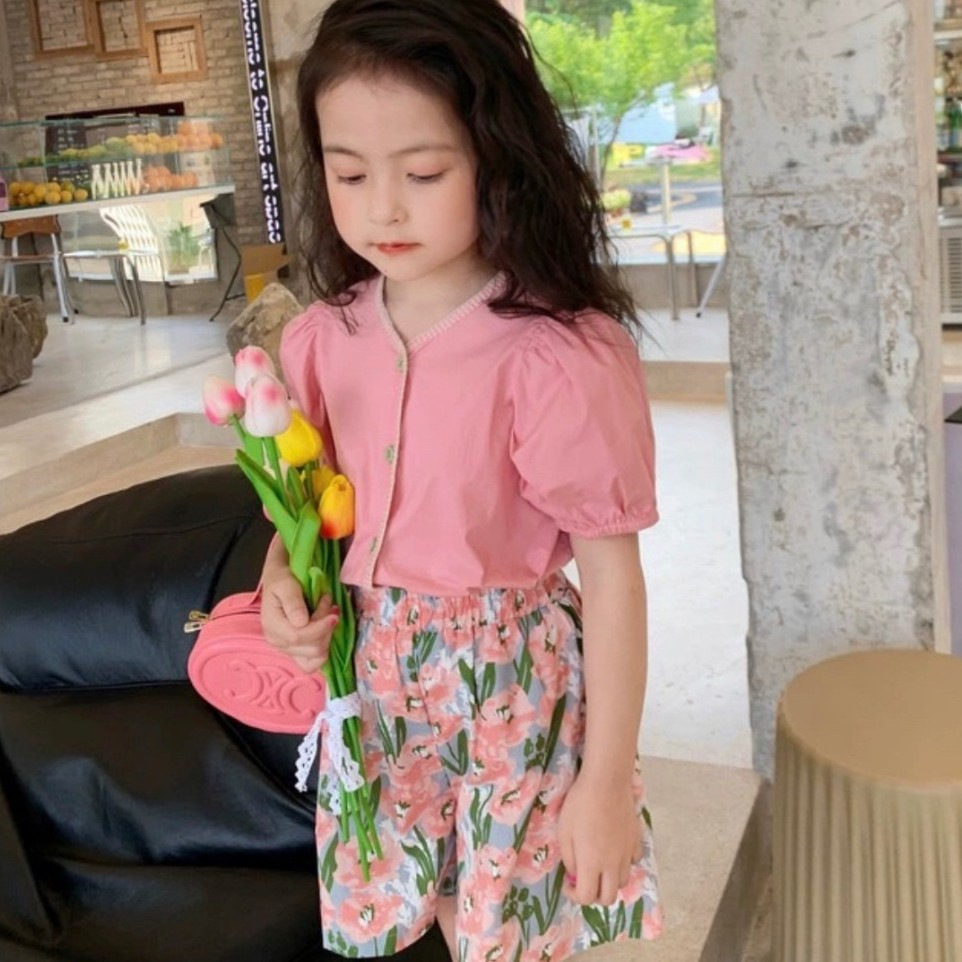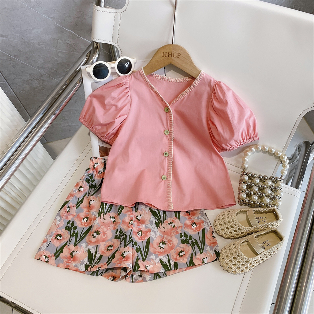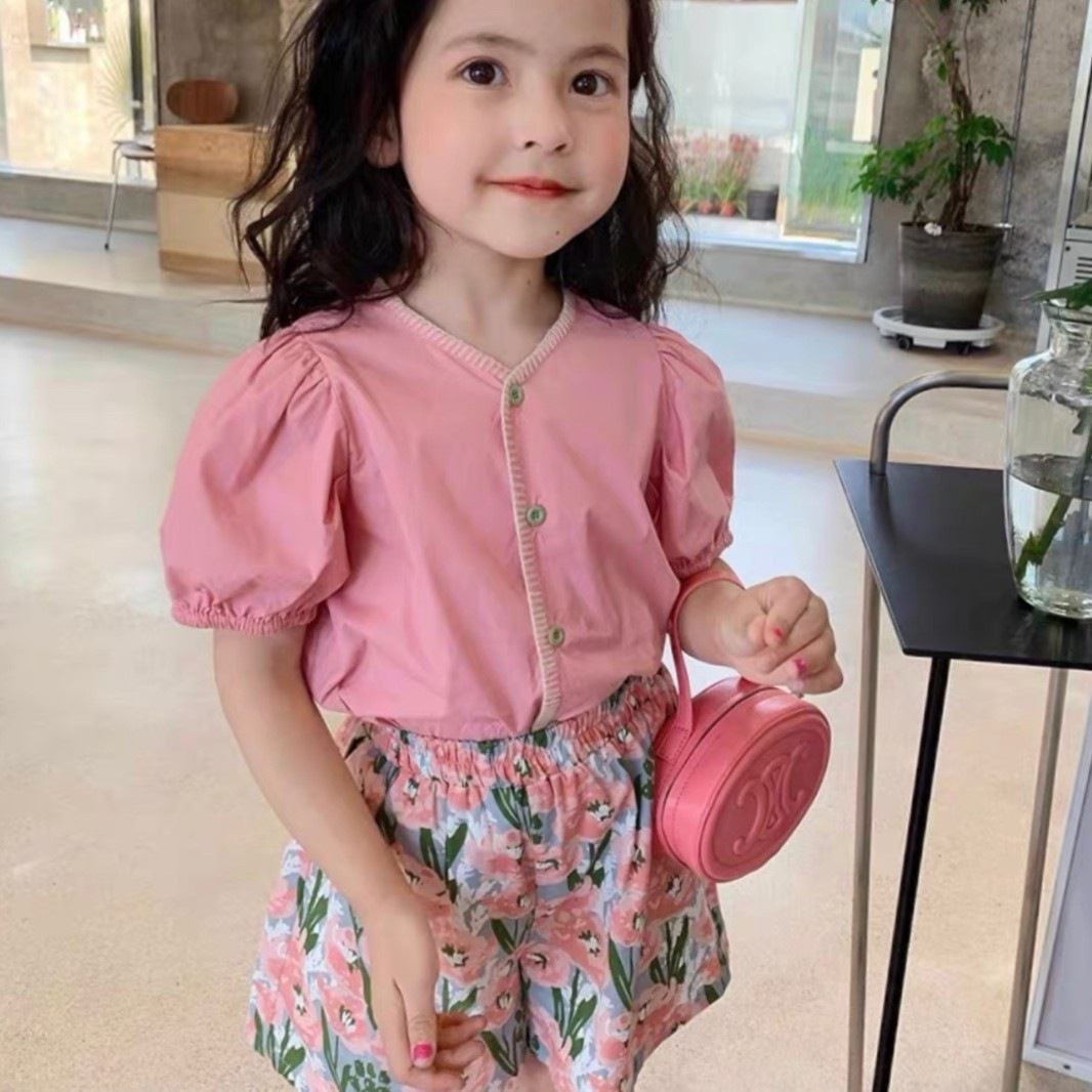 玫瑰花园女童法式短袖衬衫+五分碎花短裤两件套装2025新款