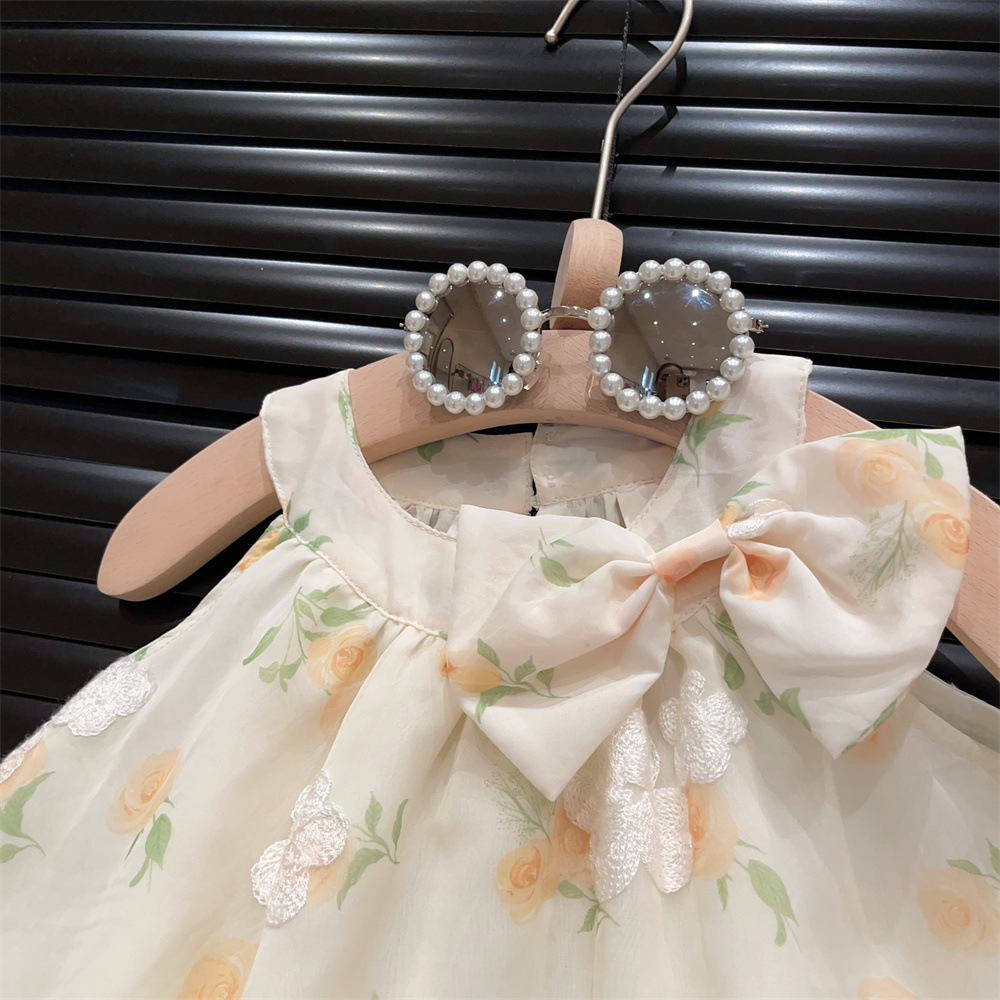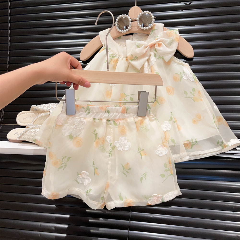 新品女童蝴蝶结装饰国风花朵刺绣娃娃衫短裤套装2025夏款两件套
