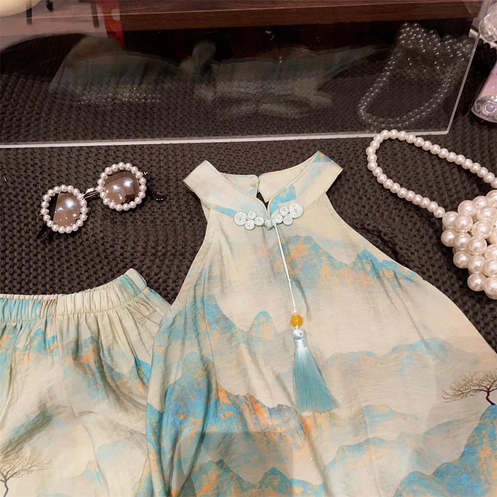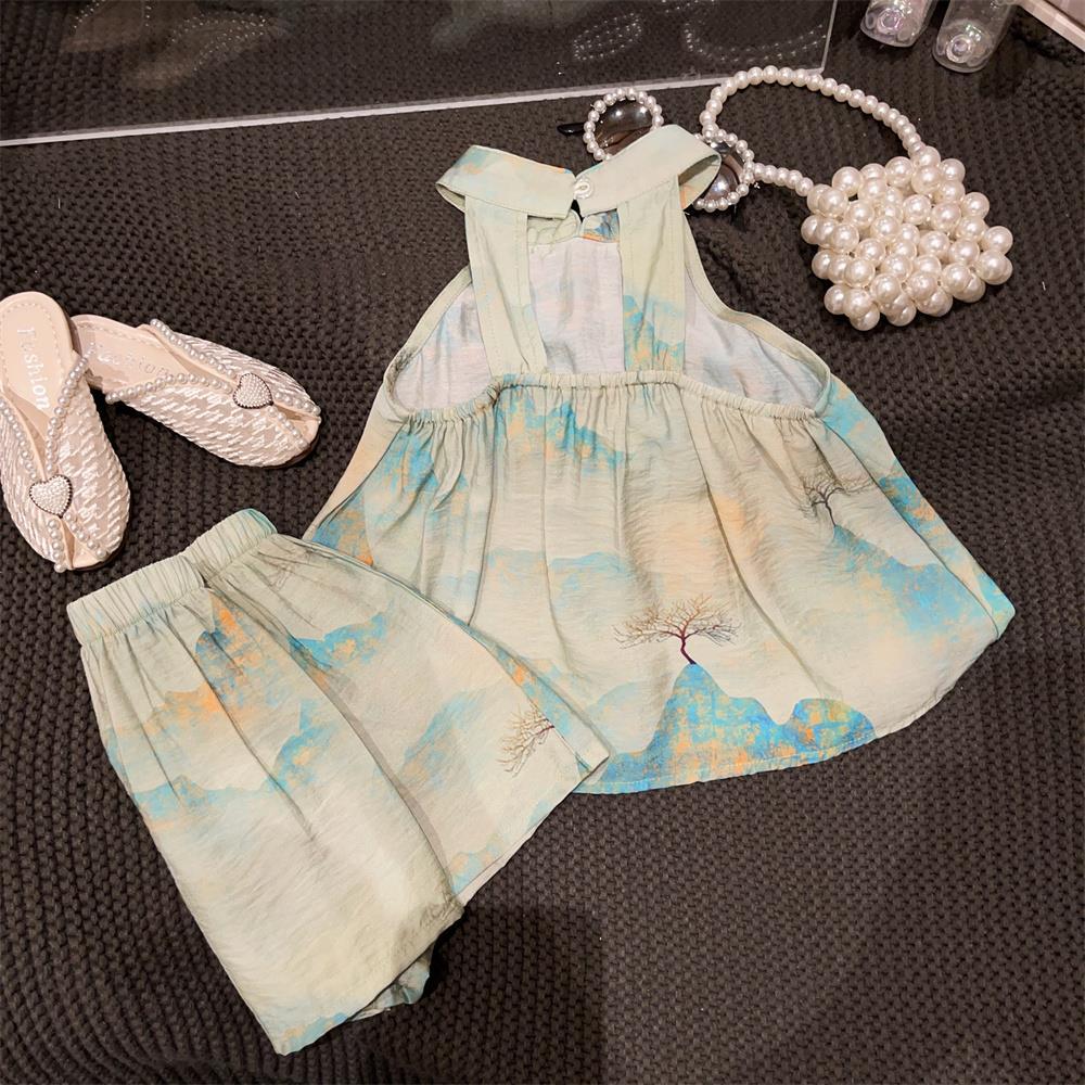 新品女童国风山水画盘扣圆领娃娃裙衫短裤两件套2025夏装套装