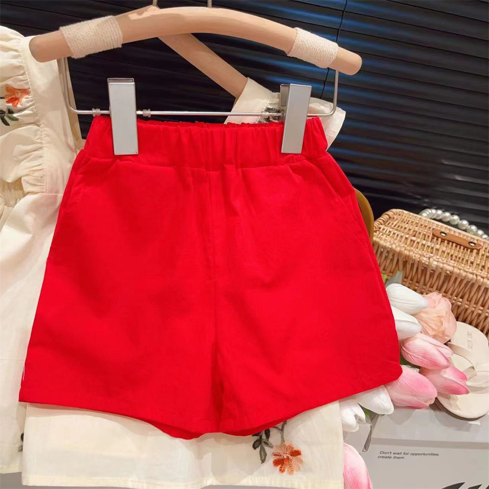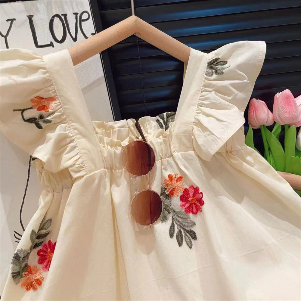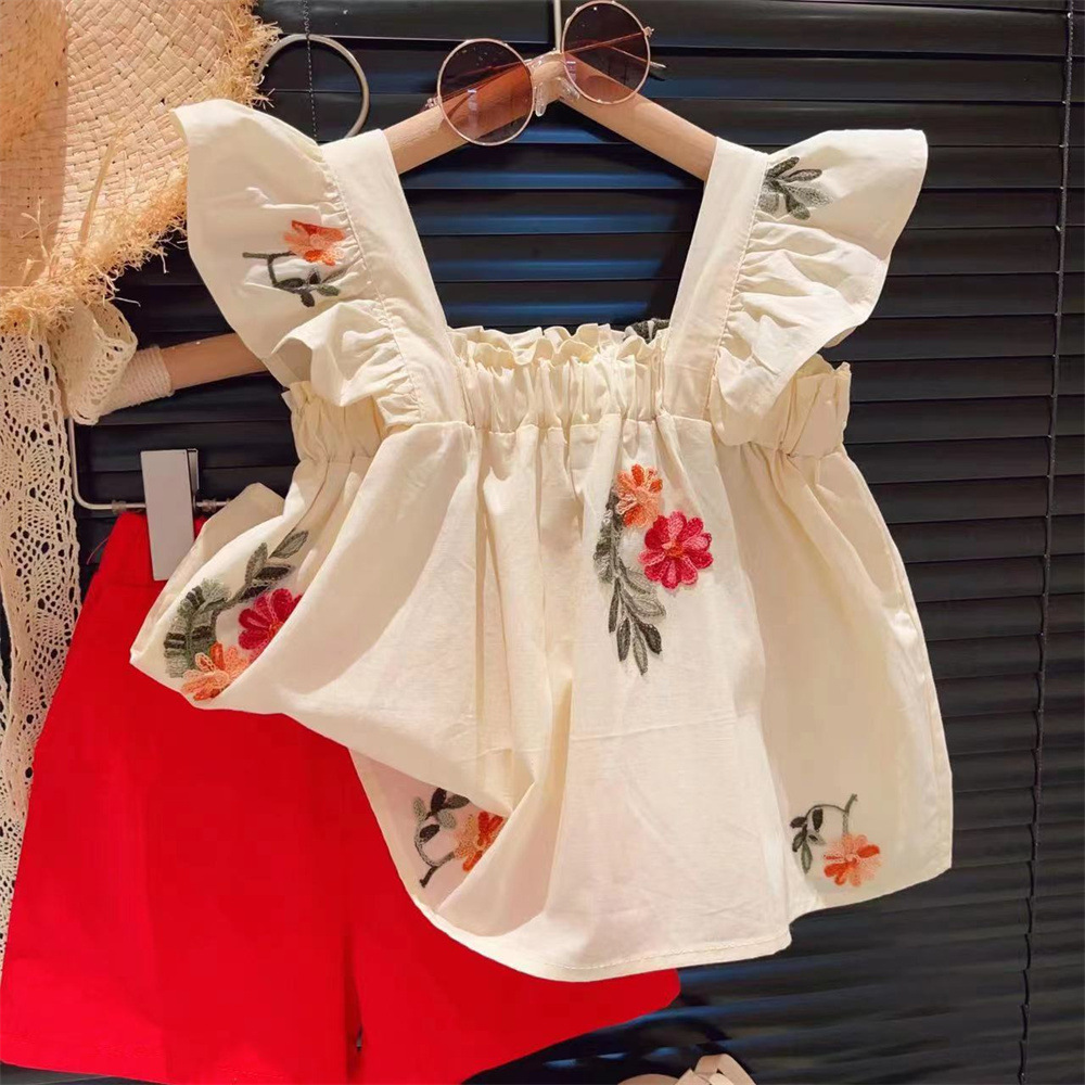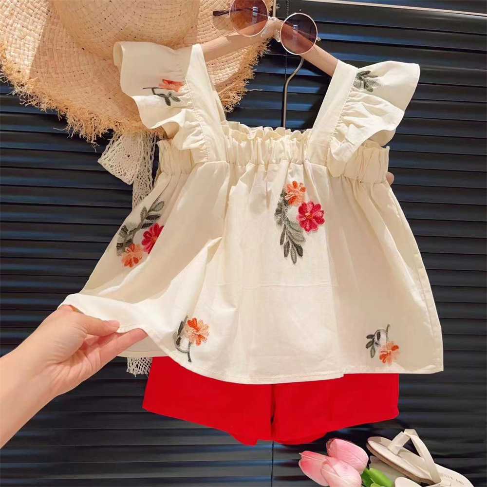 新品套装女童花朵刺绣花边松紧吊带娃娃衫短裤两件套2025夏装