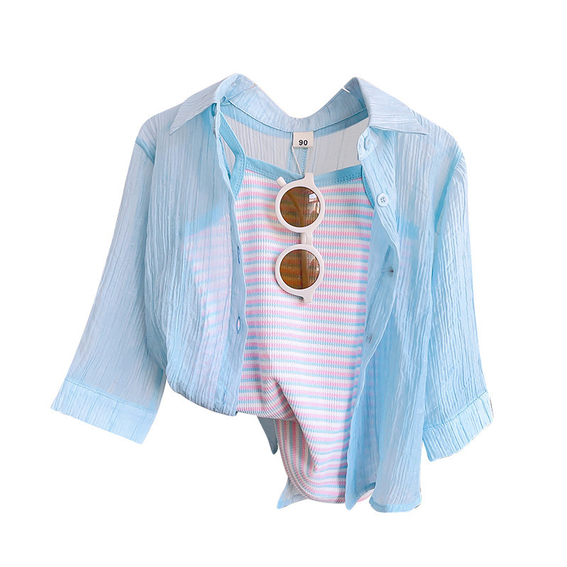 夏季新款两件套装女长袖薄款防晒衬衫上衣搭配条纹小背心套装
