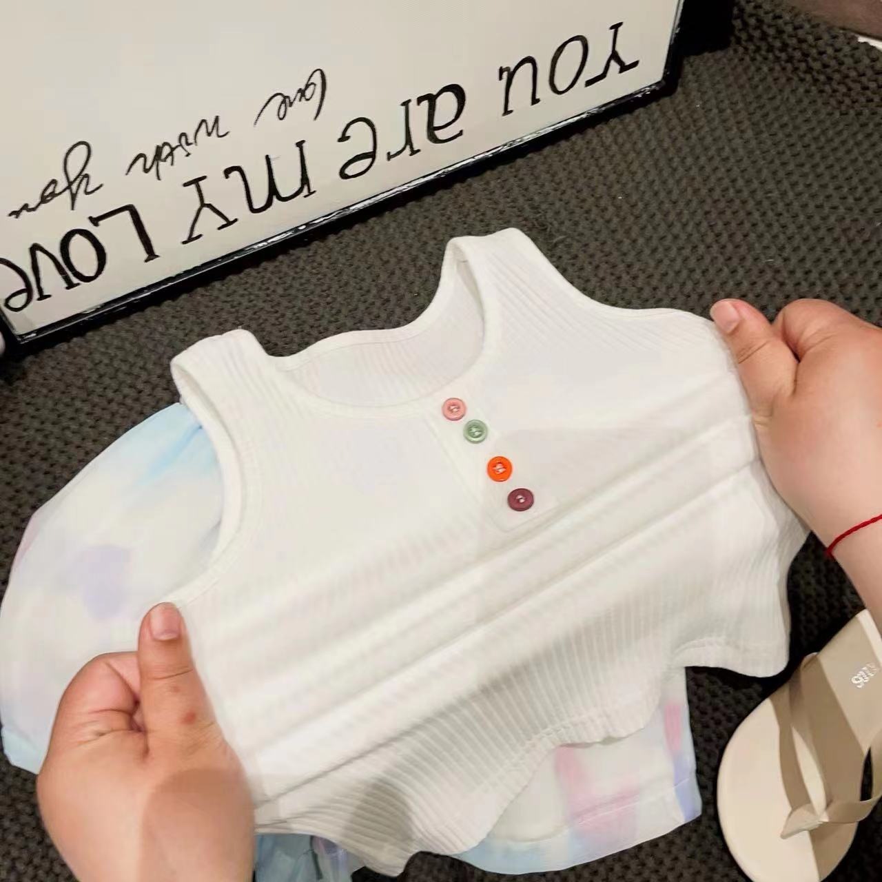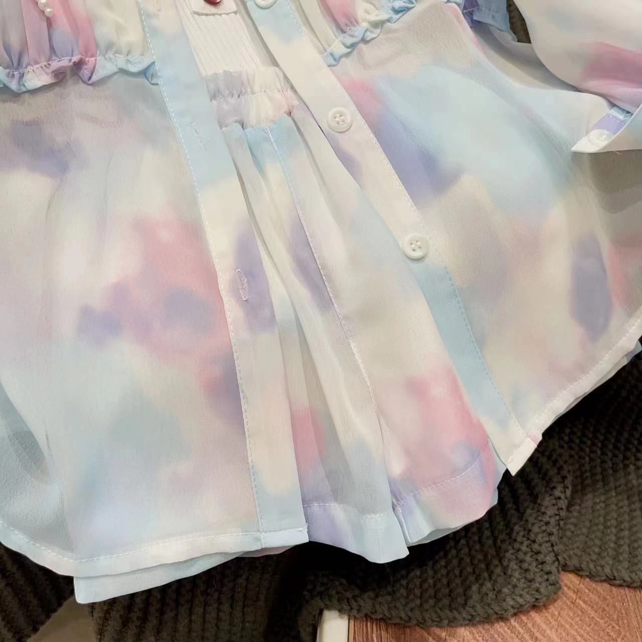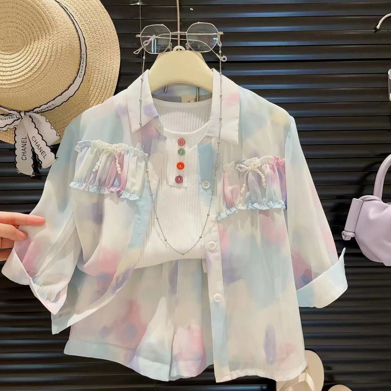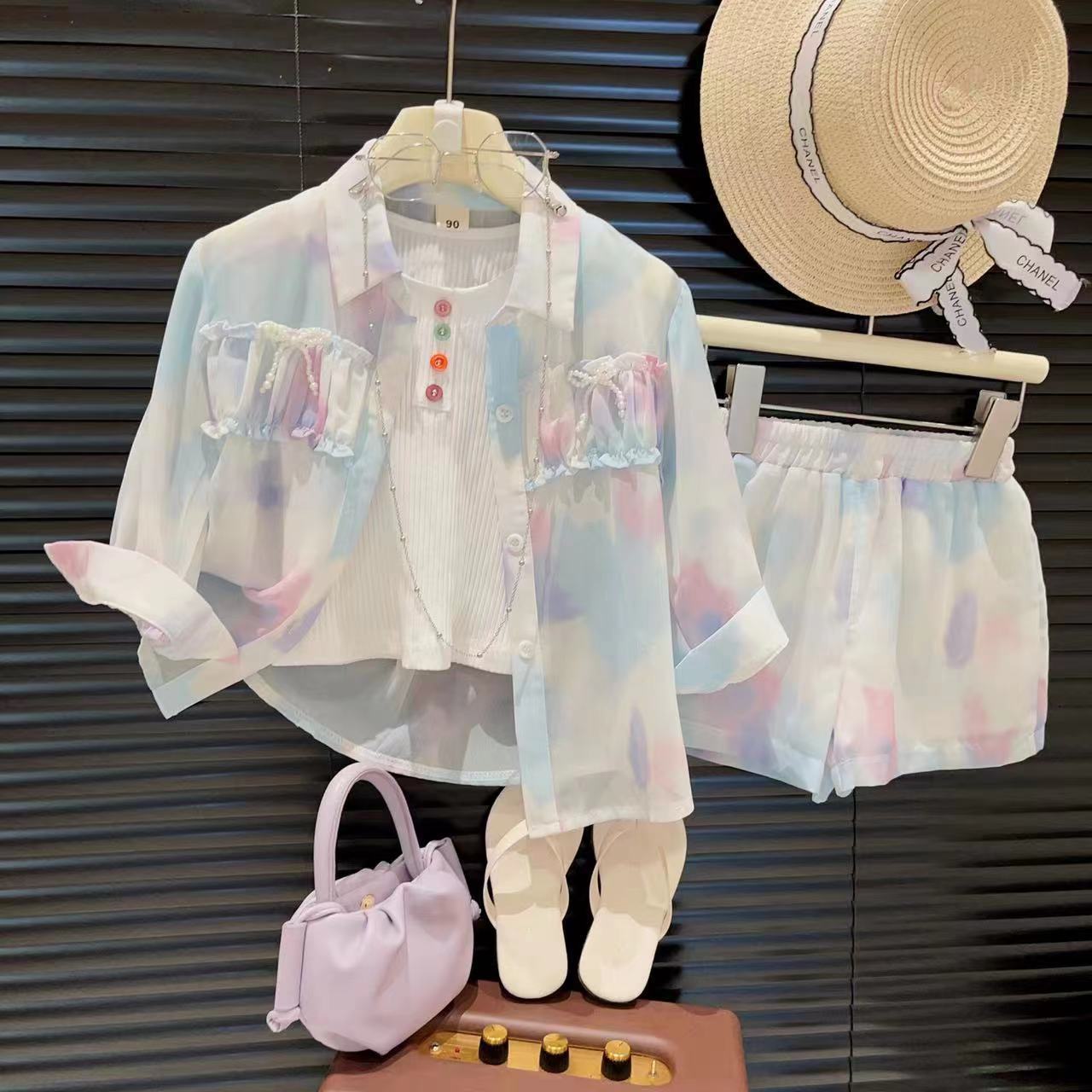 新品女童渐变拼色洋气外套短裤打底衫防晒三件套2025夏装两件套