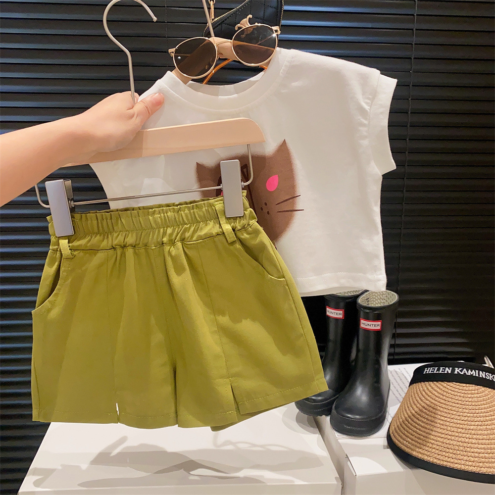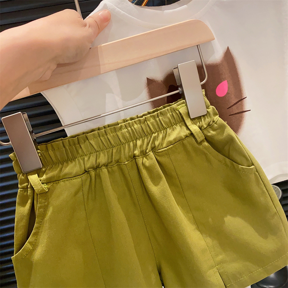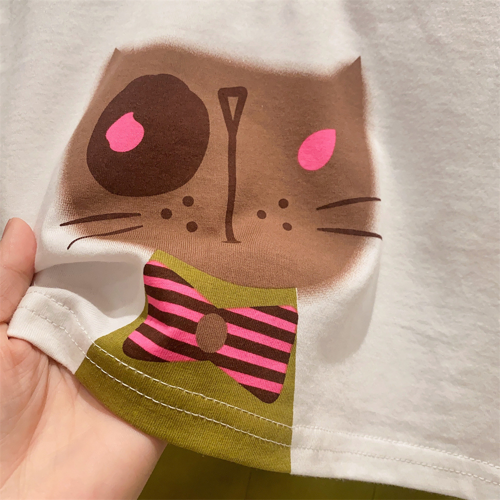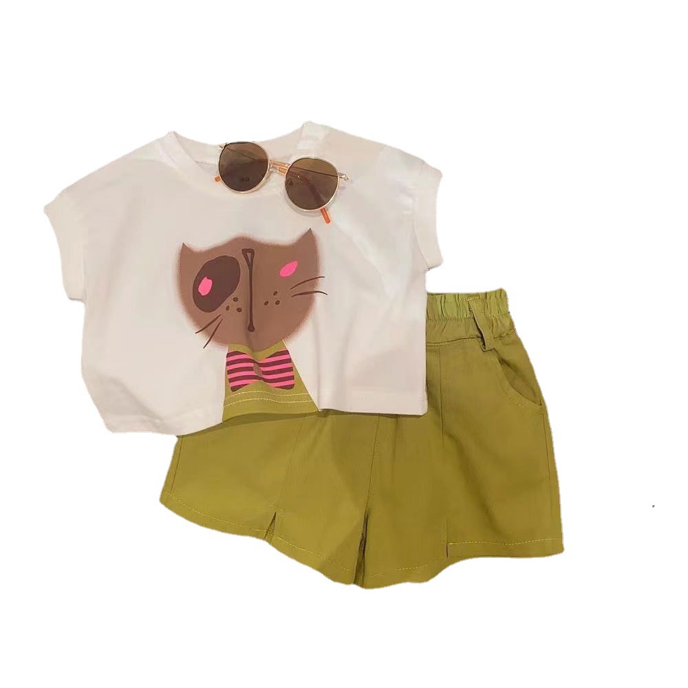 新品女童套装猫咪印花蝙蝠衫压褶短裤两件套2025夏装宽松纯棉休闲