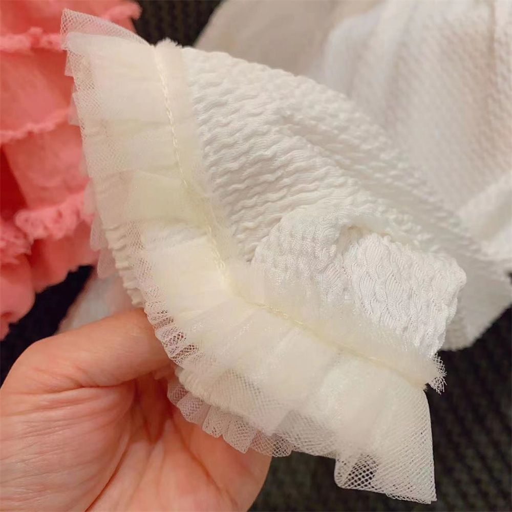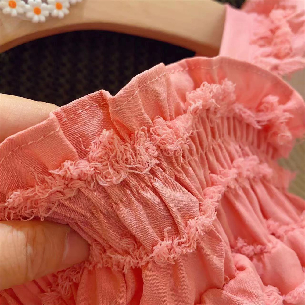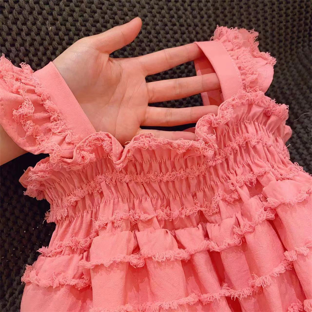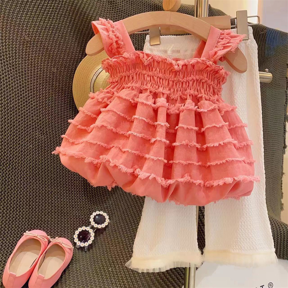 新品女童套装松紧蛋糕吊带娃娃衫蕾丝边休闲裤两件套2025夏装
