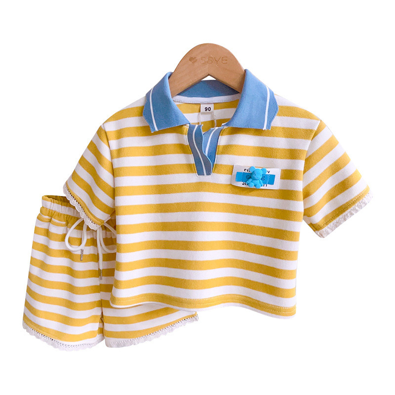 时尚卡通休闲套装女童夏季韩系撞色条纹POLO衫短裤两件套