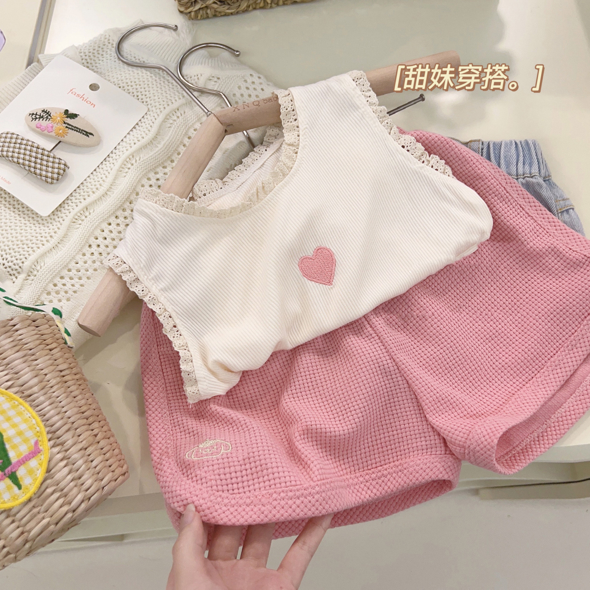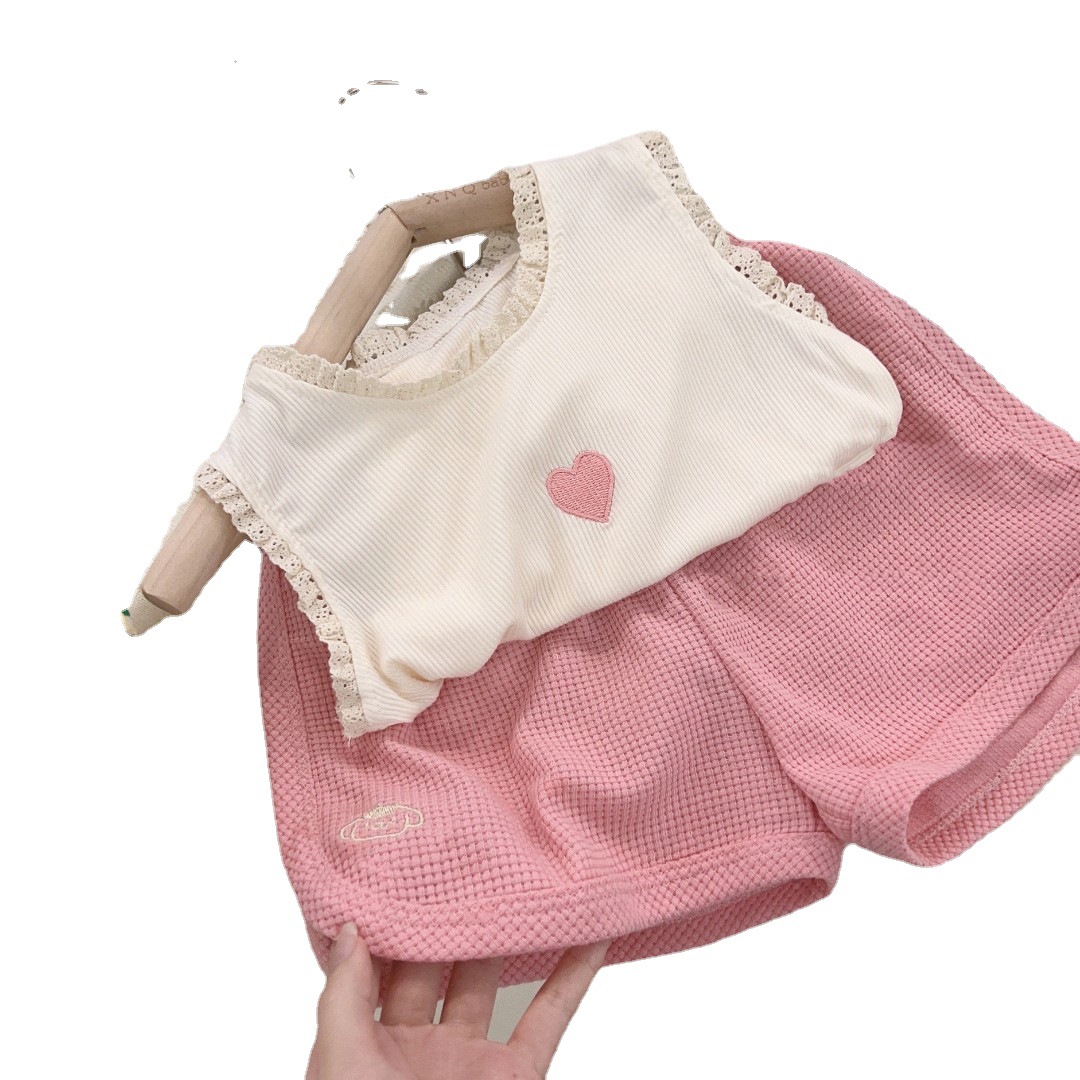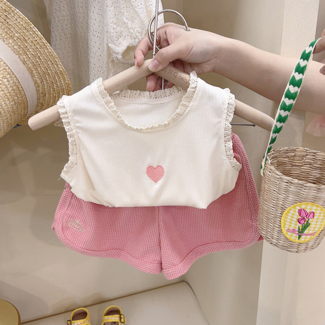 新品女童套装爱心刺绣坑条打底衫华夫格短裤两件套2025中小童夏装