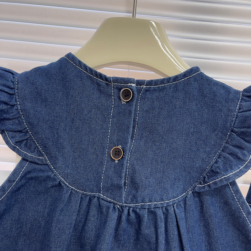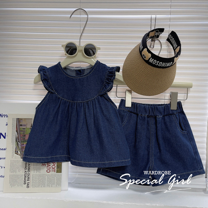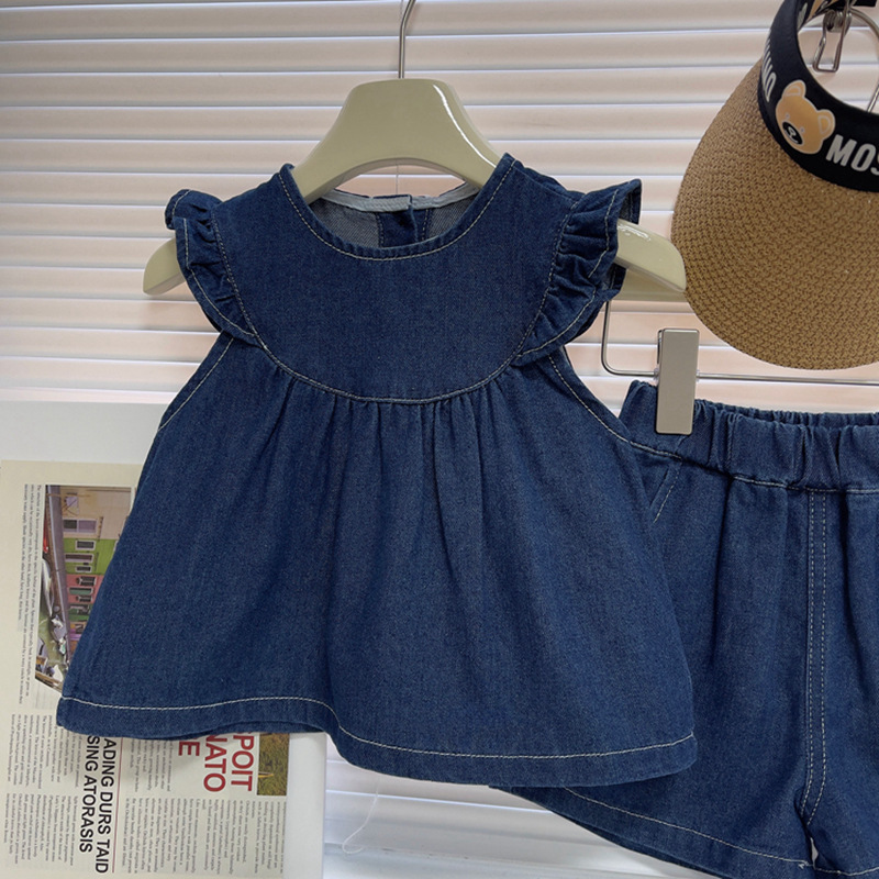 2025新款女童短裤套装洋气木耳边无袖娃娃衫中小童牛仔两件套