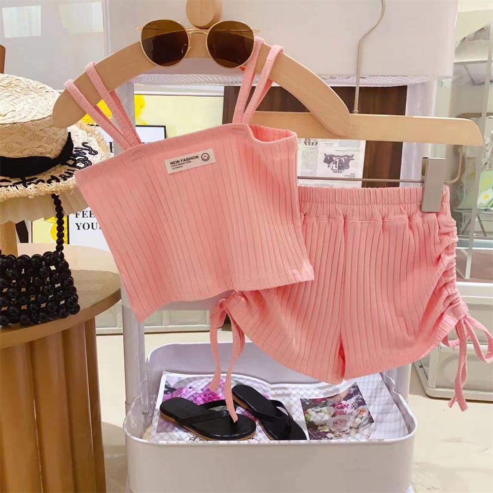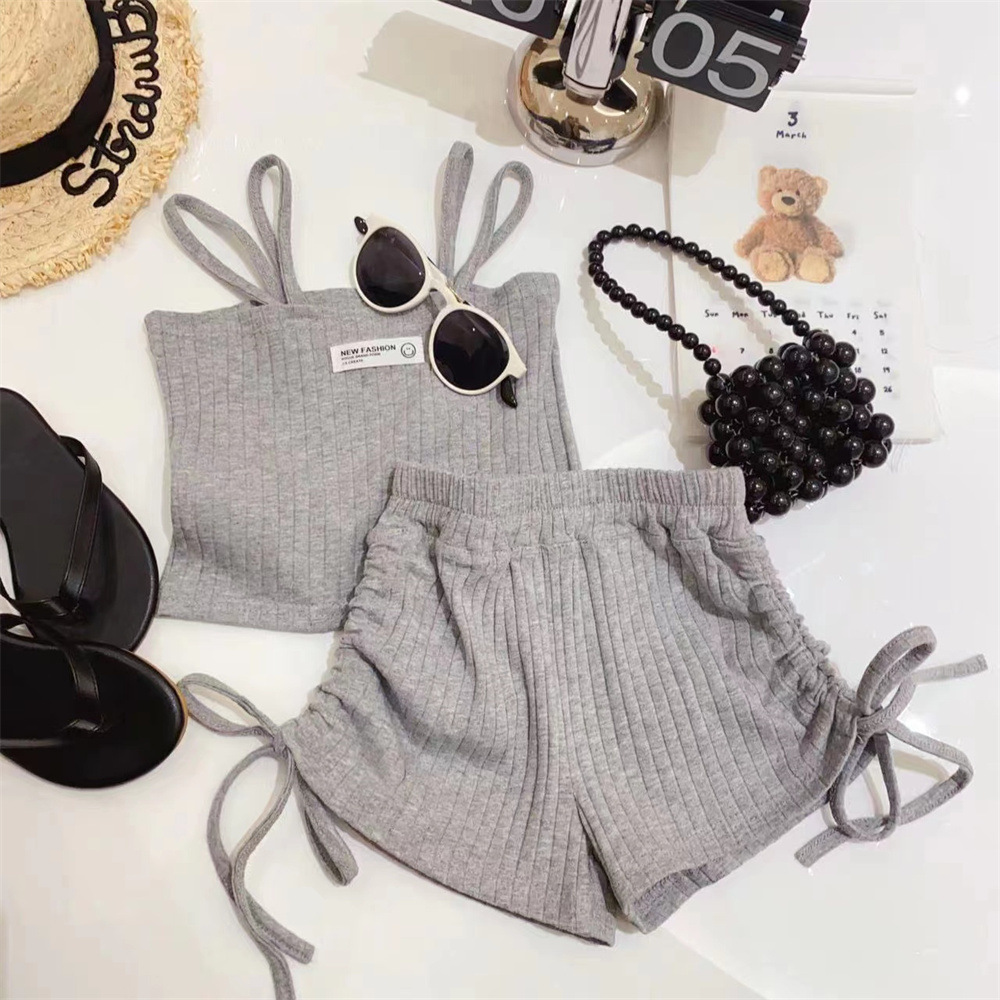 新品女童字母坑条高弹吊带背心系带短裤两件套2025夏装