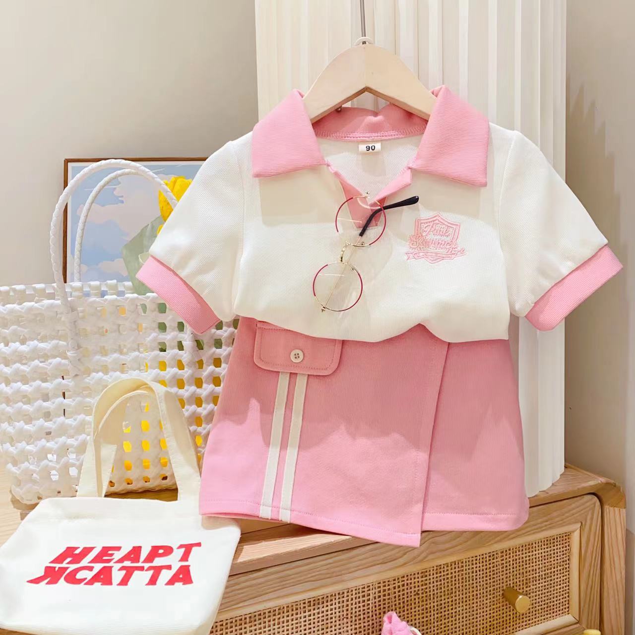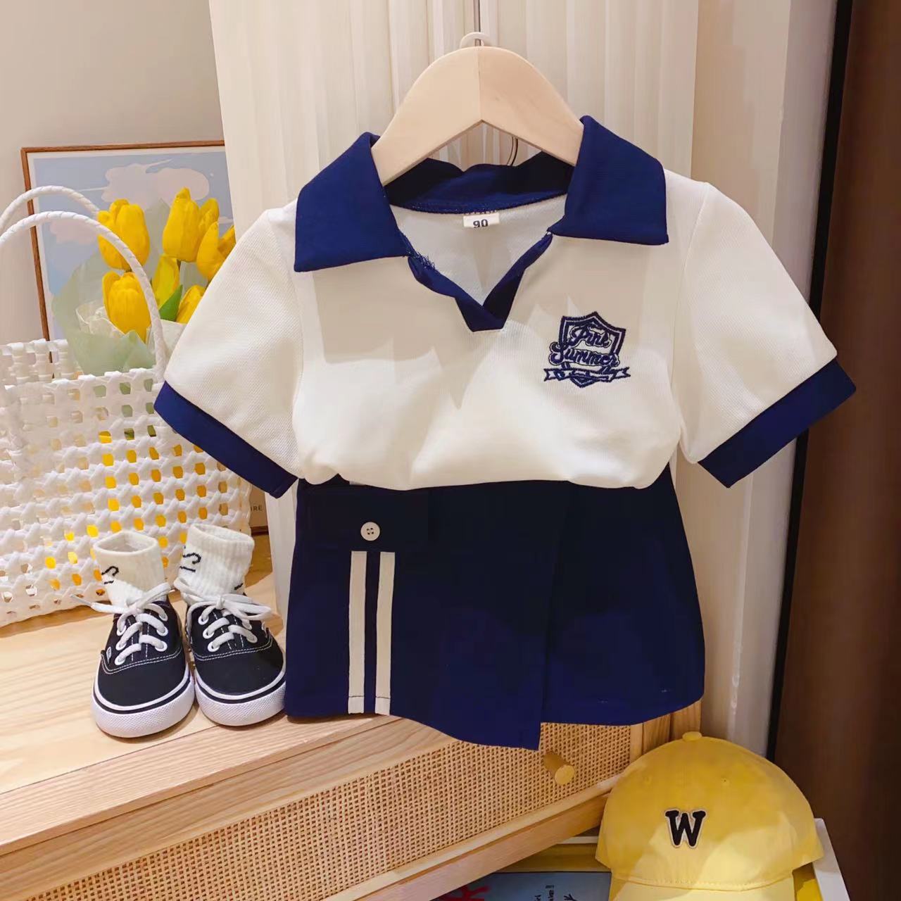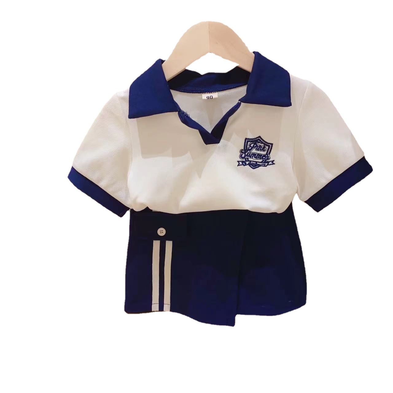 女童套装Polo领洋气刺绣贴标打底衫短裙两件套2025夏装