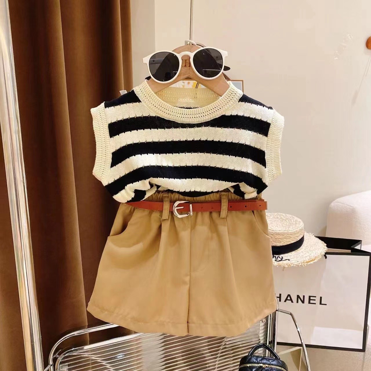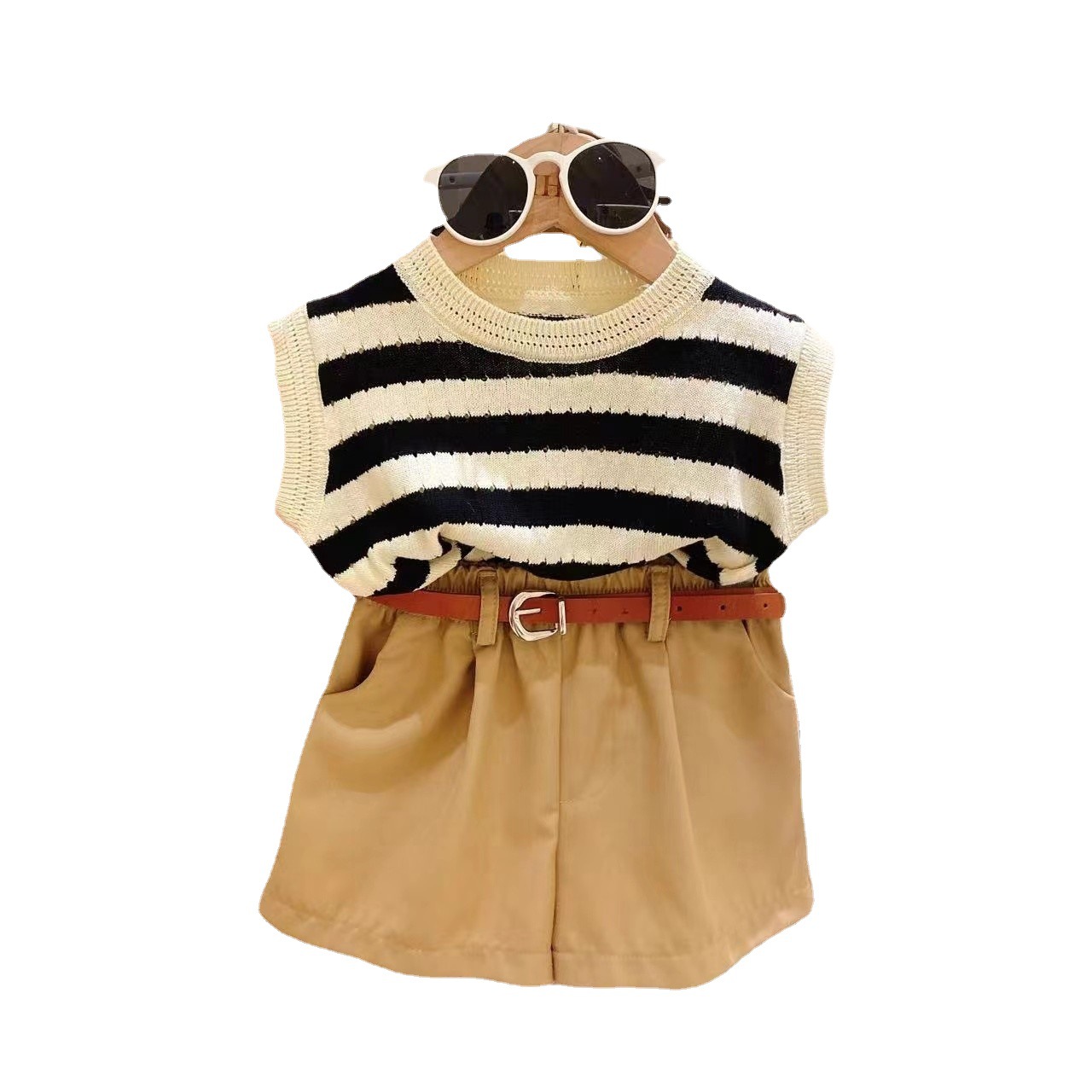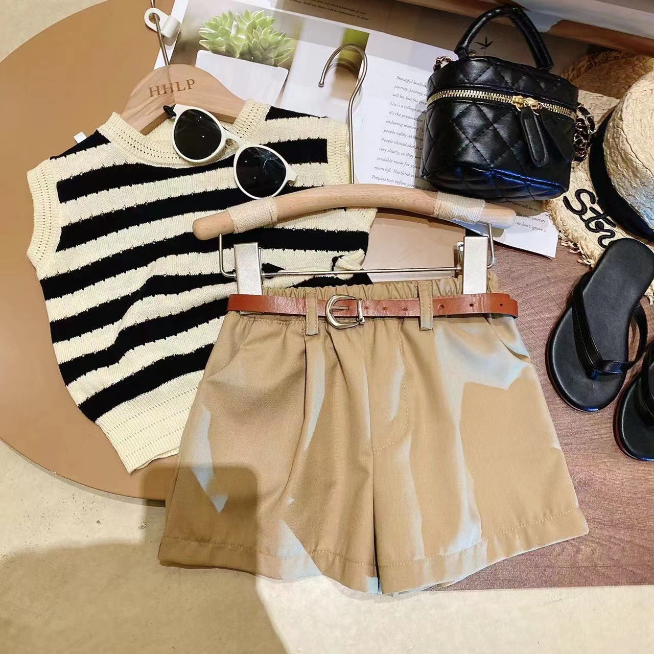 新品女童套装针织包边条纹弹力背心英伦风短裤两件套2025夏装