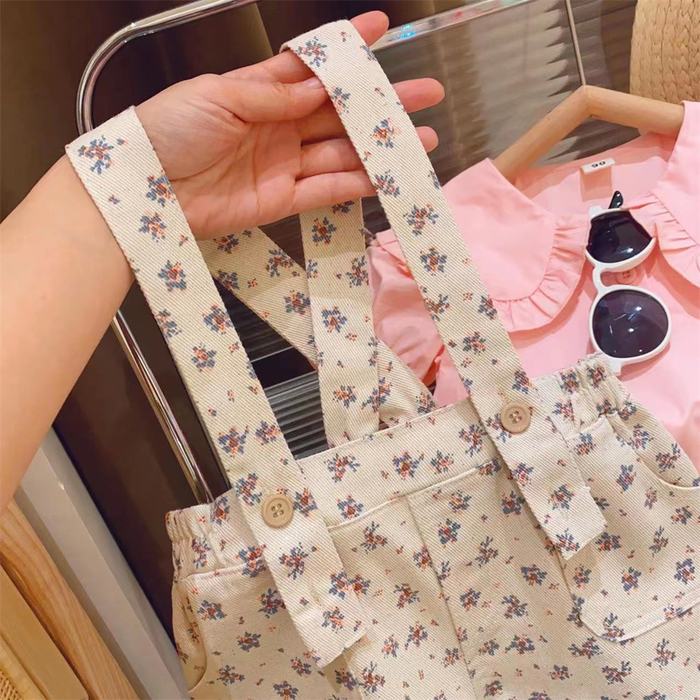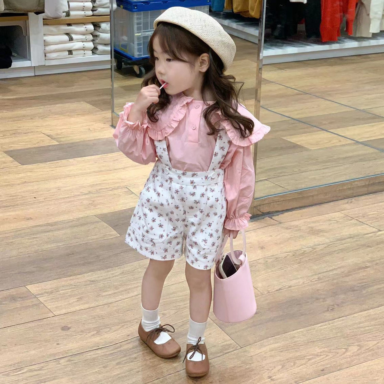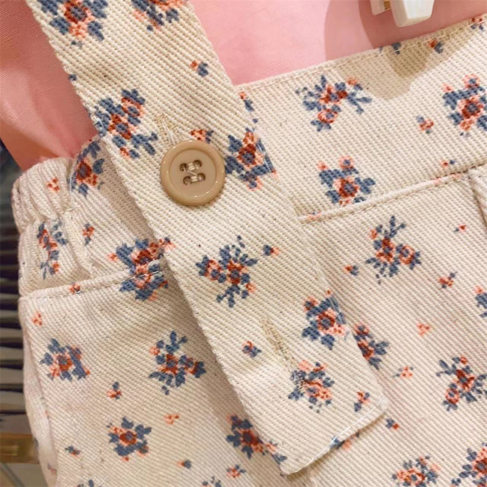 新品女童翻领喇叭短袖打底衫碎花吊带短裤两件套2025夏装套装