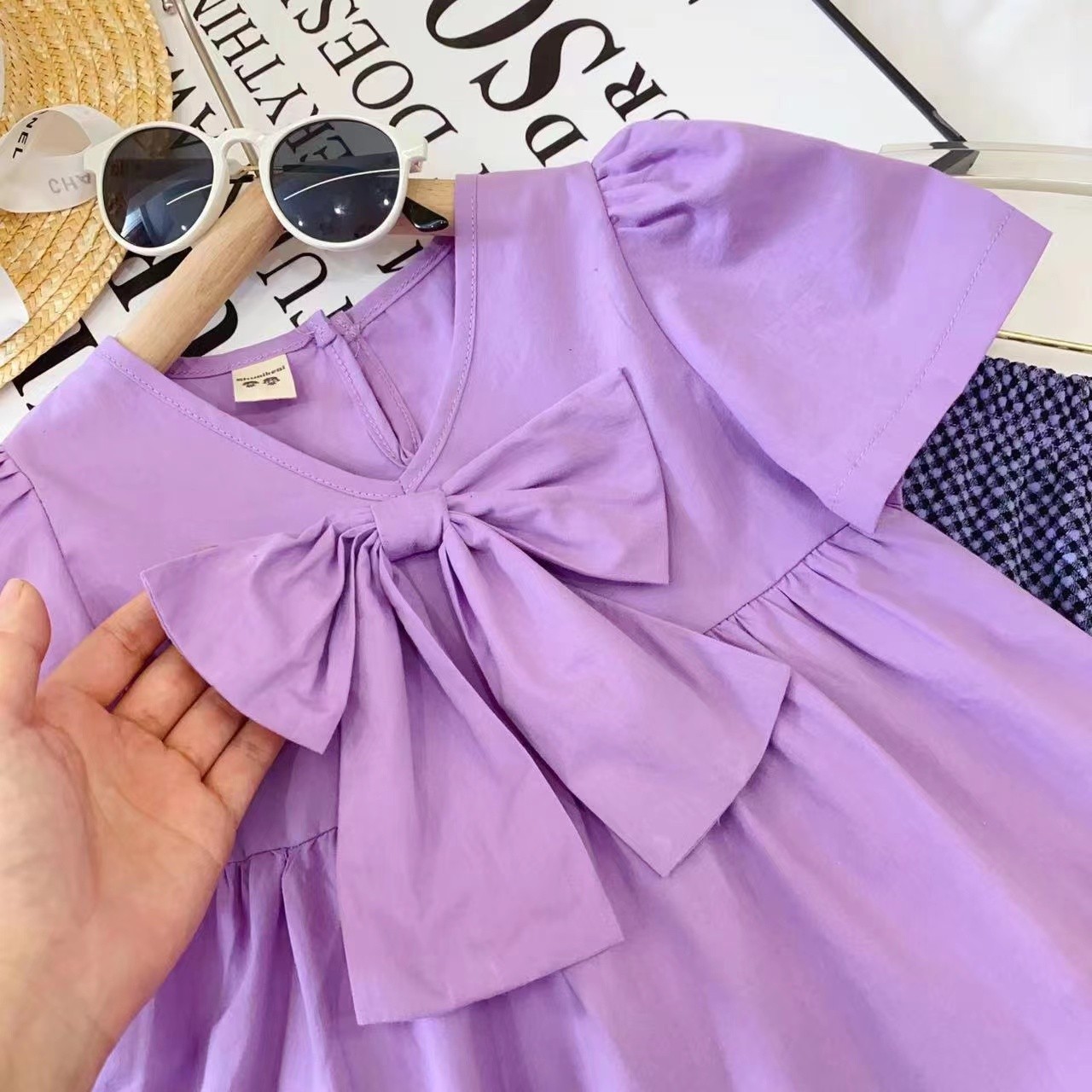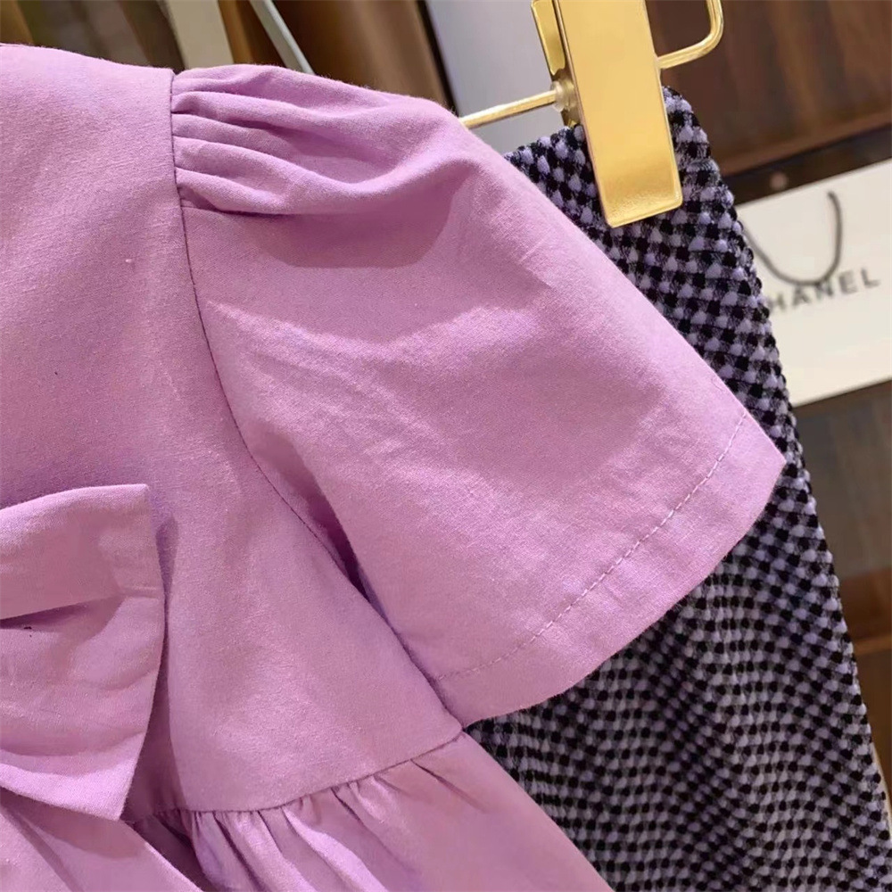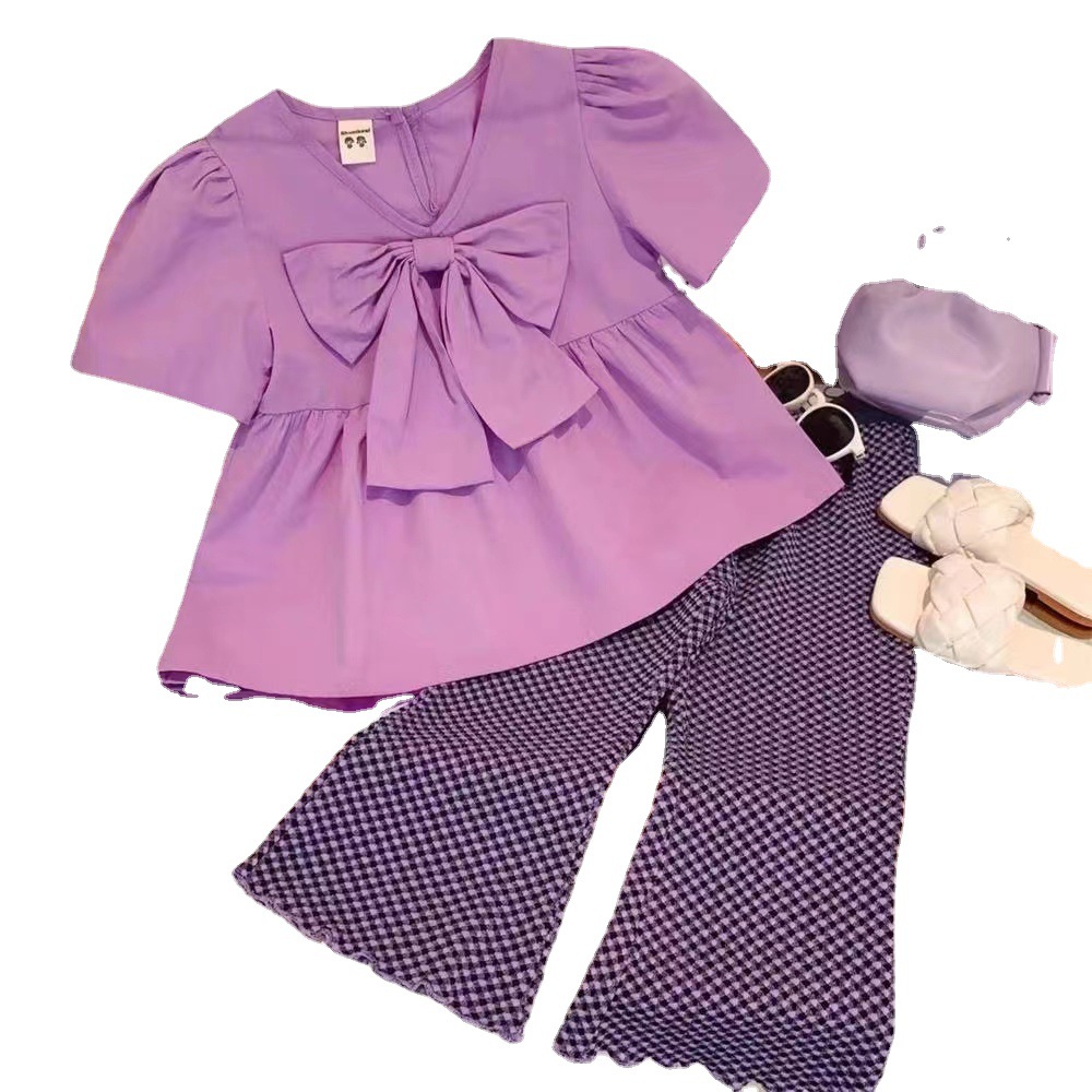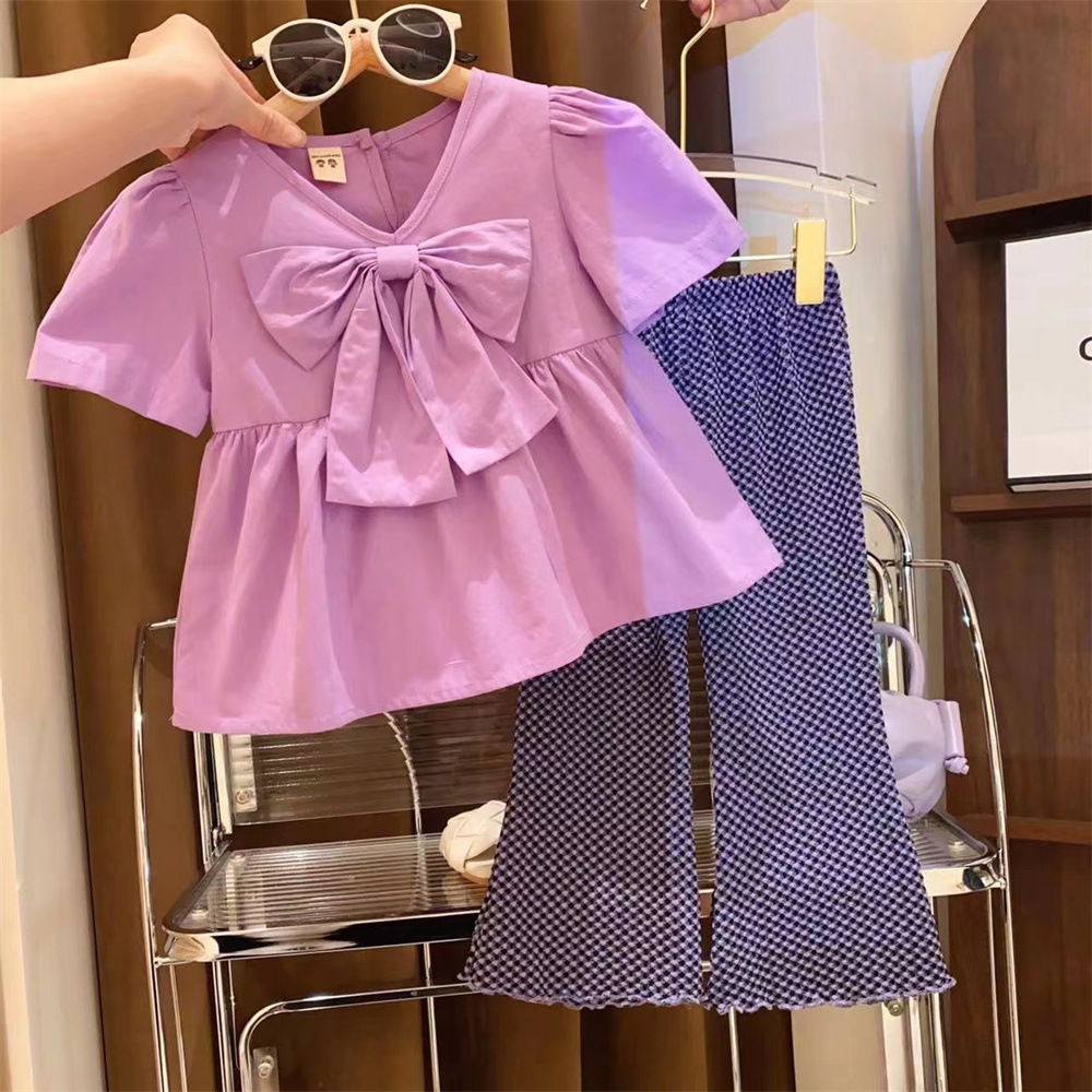 新品女童大蝴蝶结娃娃衫小格子微喇裤休闲两件套2025夏装套装