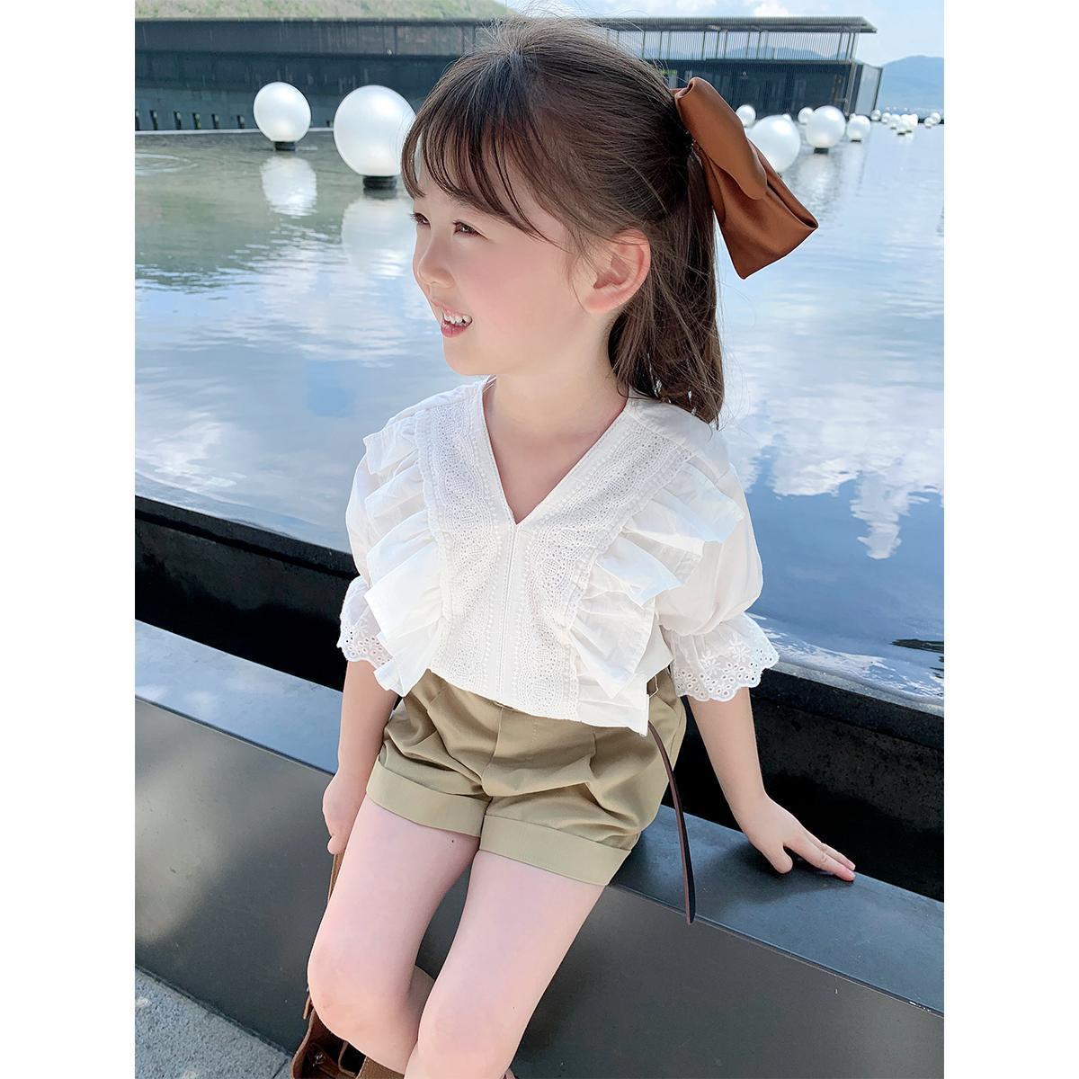 新品2025夏款女宝宝学院风白色V领衬衫休闲短裤时髦两件套套装