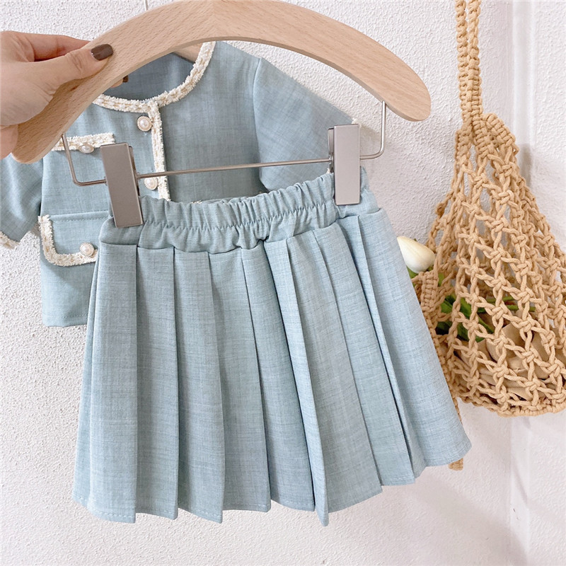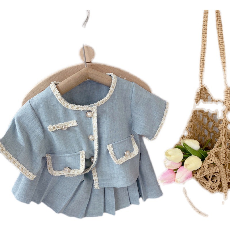 女童韩版洋气小香风短袖2件套装2025夏季新款宝宝气质上衣百褶裙