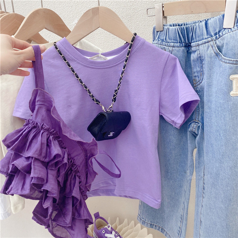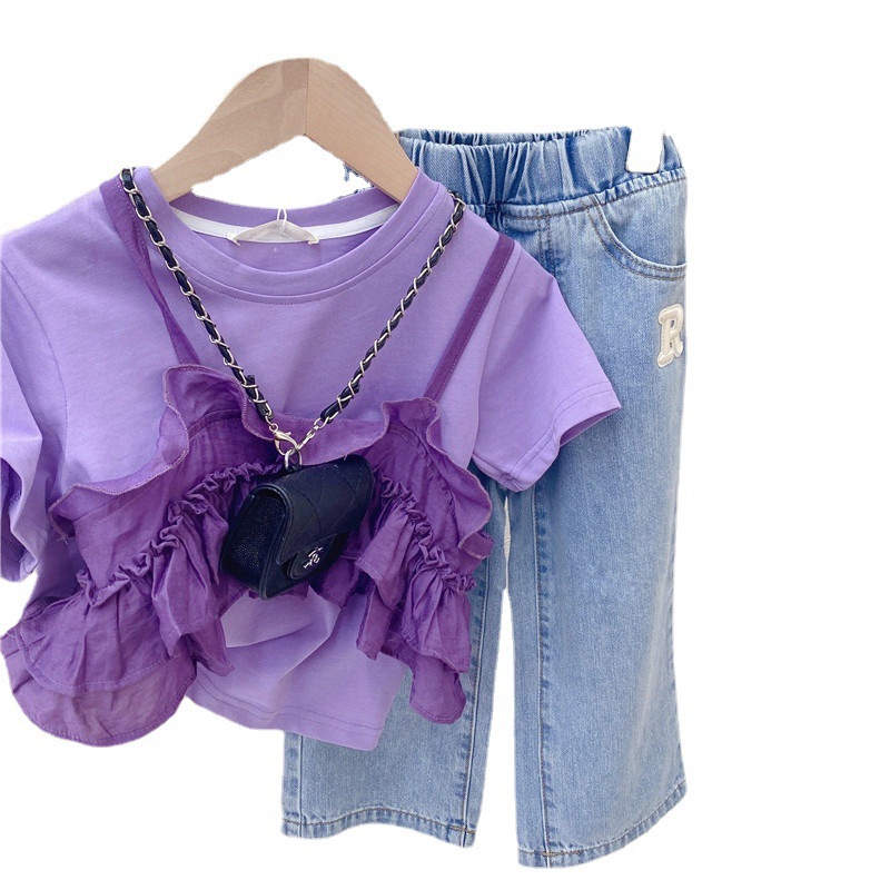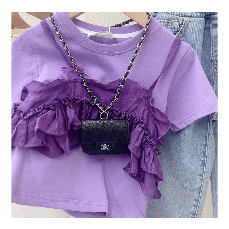 女童2025新韩版洋气两件套短袖T恤宝宝夏装儿童紫色花边上衣童装