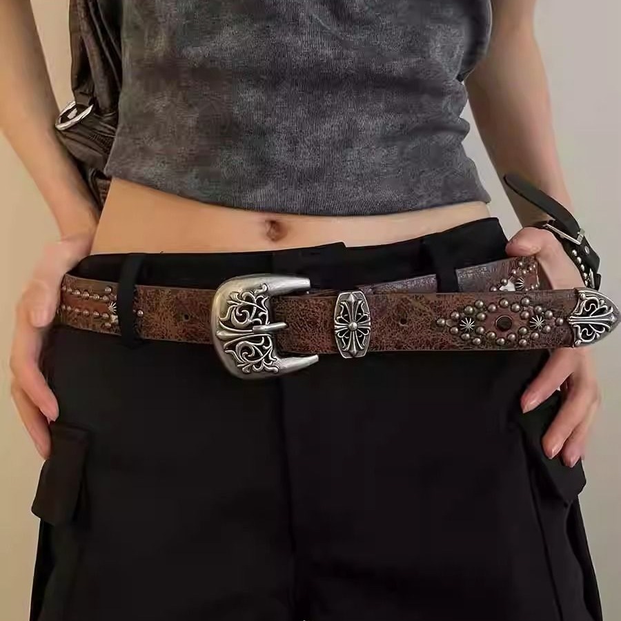 复古棕色铆钉腰带女韩版时尚百搭新款牛仔裤配饰高级感显瘦皮带潮