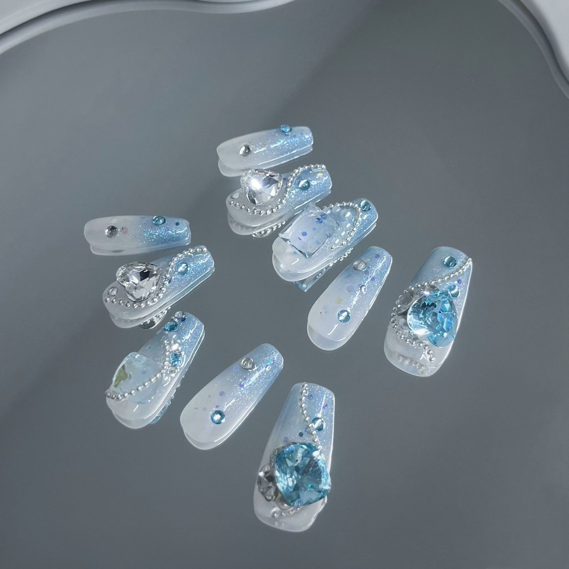 纯手工猫眼穿戴甲蓝色大海K9贴钻重工光疗甲可拆卸重复美甲片批发