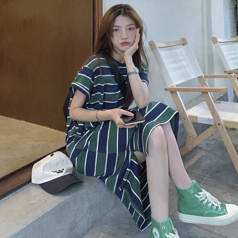 【价值高于价格】懒人条纹连衣裙中长款直筒裙夏季棉短袖t恤裙女