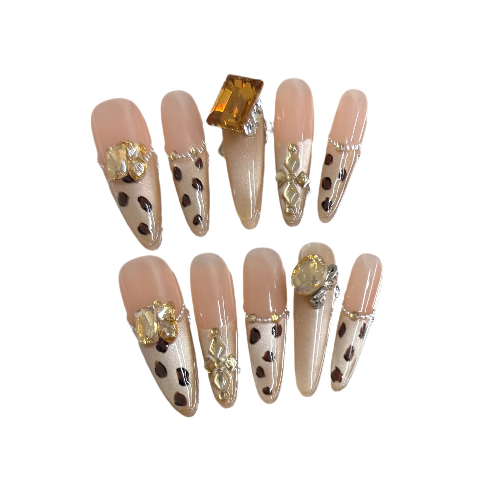 纯手工穿戴甲千金豹纹高端气质美拉德焦糖方钻轻奢法式猫眼美甲片