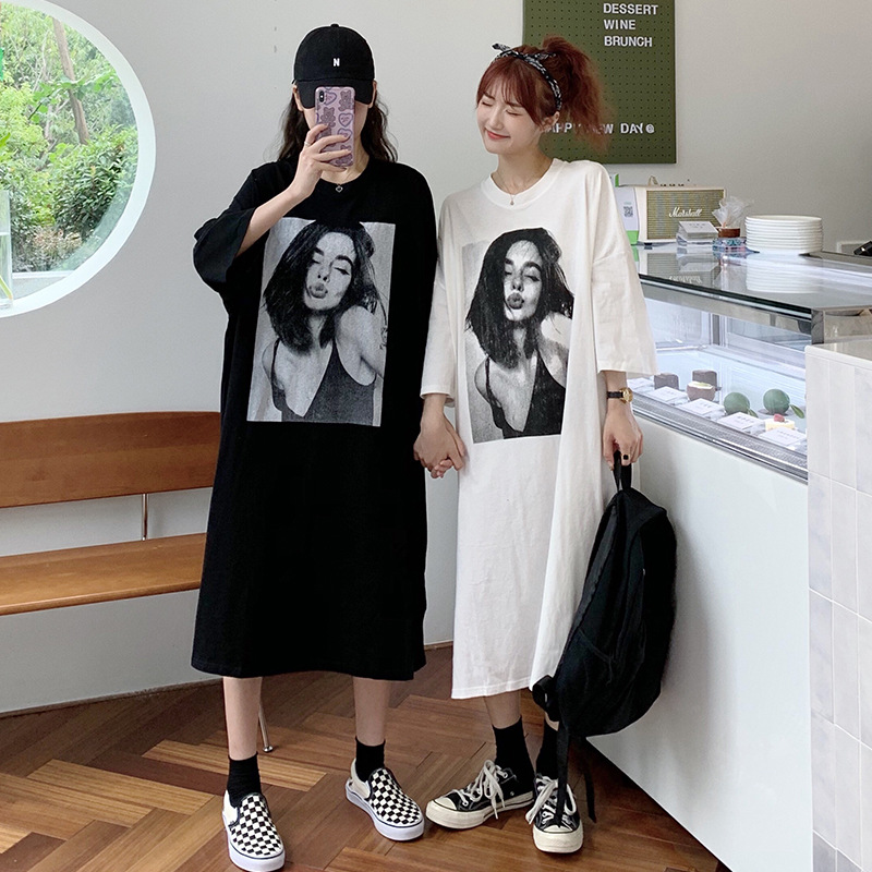 韩版新款宽松慵懒风长款T恤胖MM大码oversize孕妇短袖长裙夏