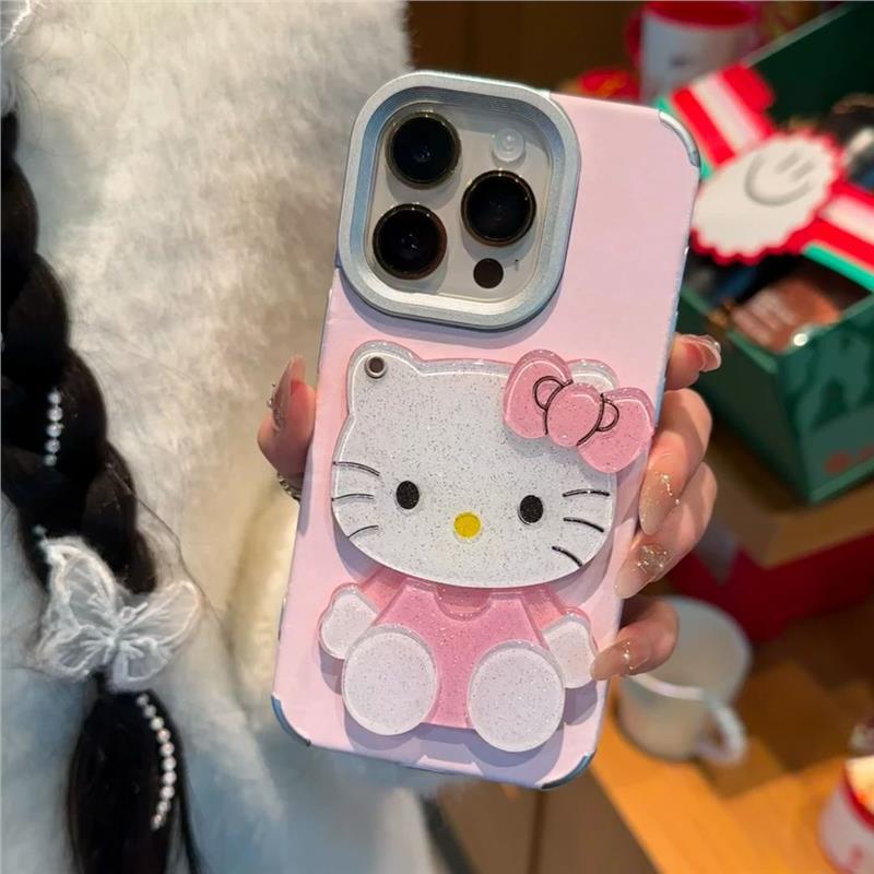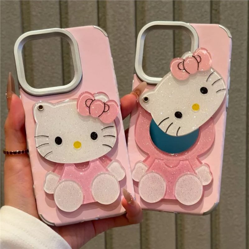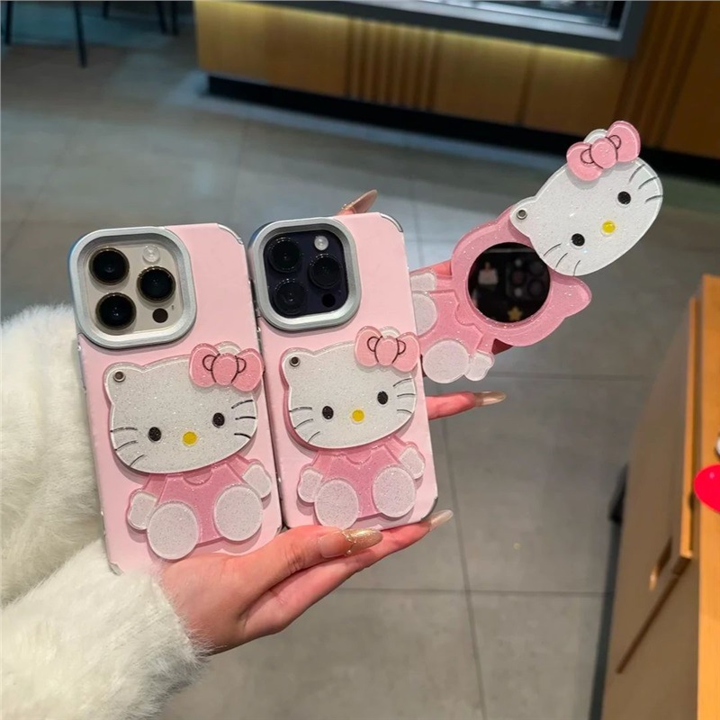 粉色KT猫镜子粉雪山纹适用iPhone16Promax苹果15壳13高级感12
