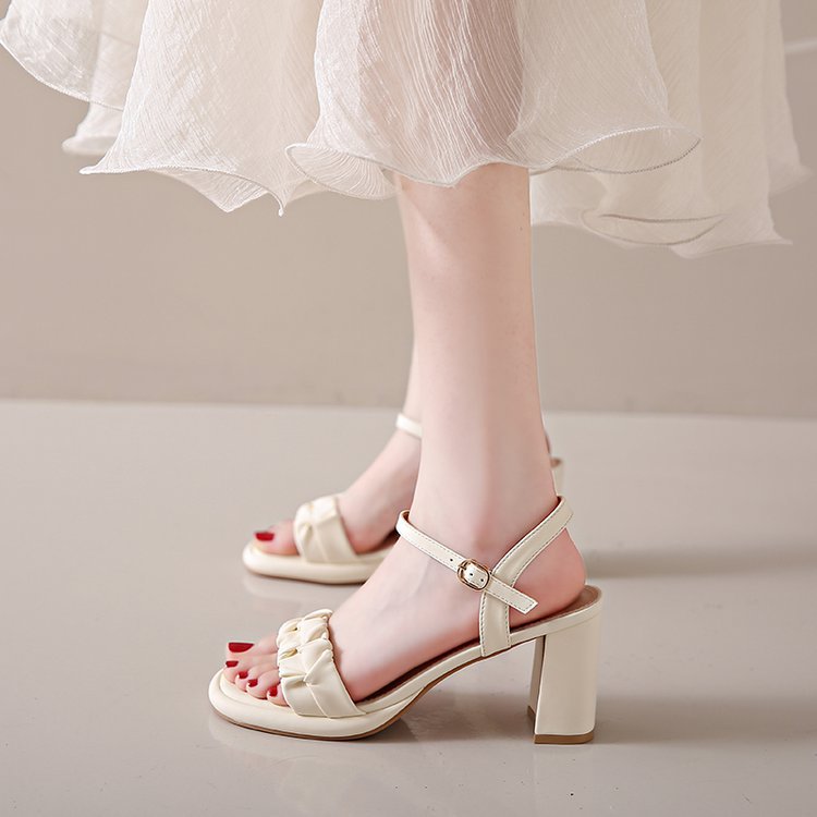 夏季新款韩版粗跟凉鞋女一字搭扣高跟鞋露趾褶皱时装女鞋