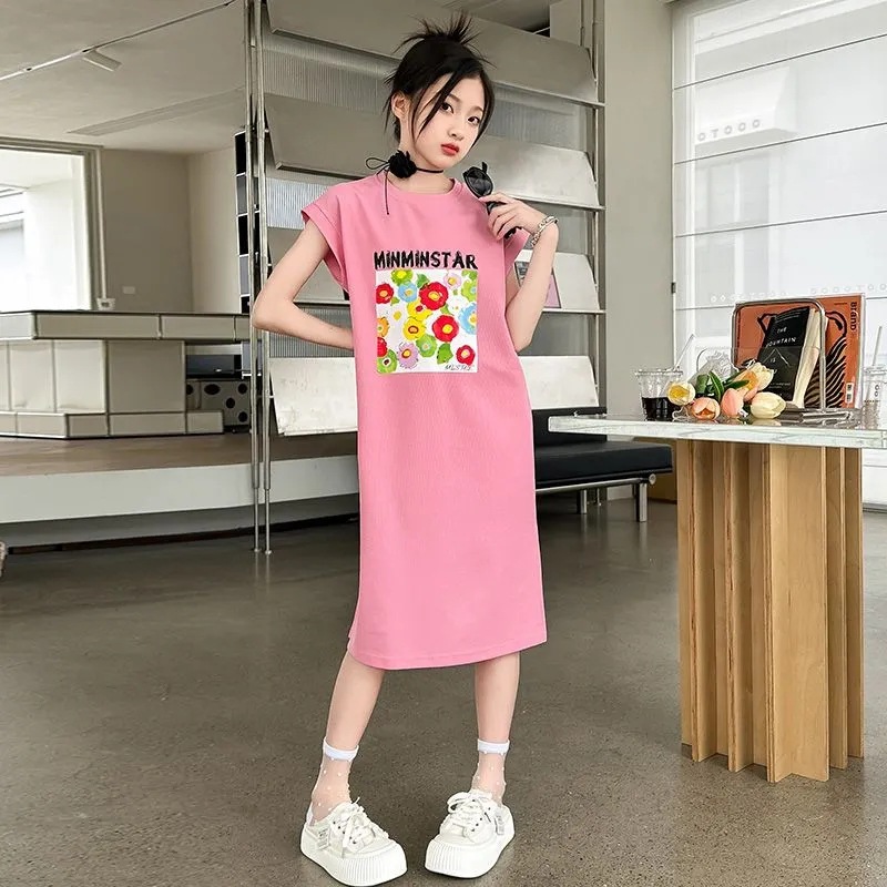 女童无袖连衣裙夏季新款儿童网红时髦休闲长裙中大童韩版T恤裙子.