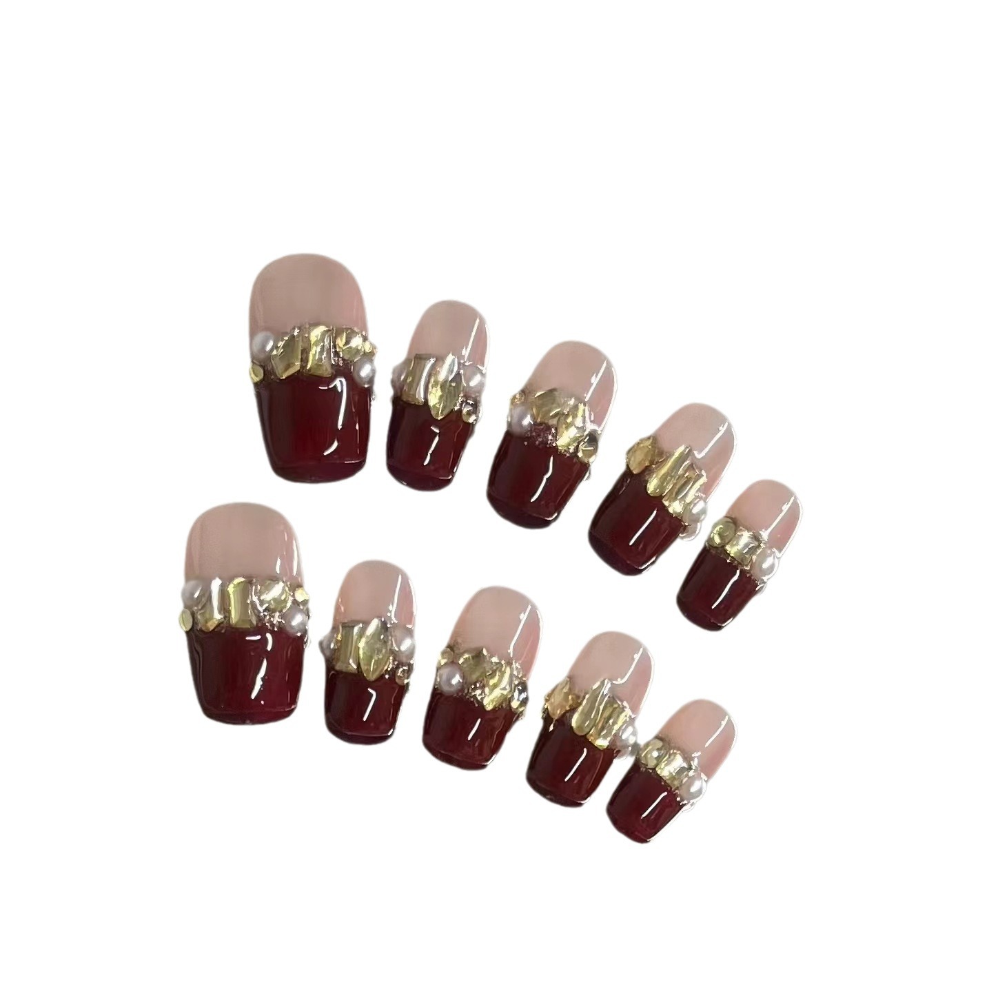 穿戴甲手作纯欲风新年美甲女喜庆酒红色法式爆闪猫眼手工美甲批发