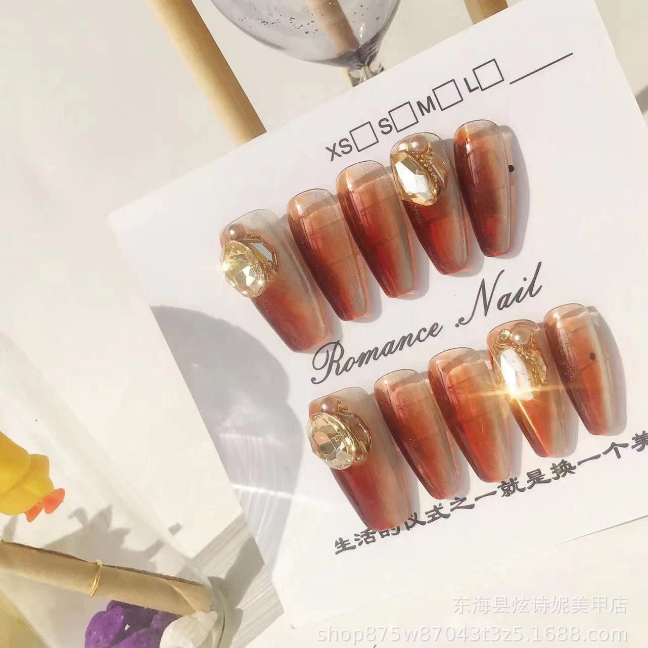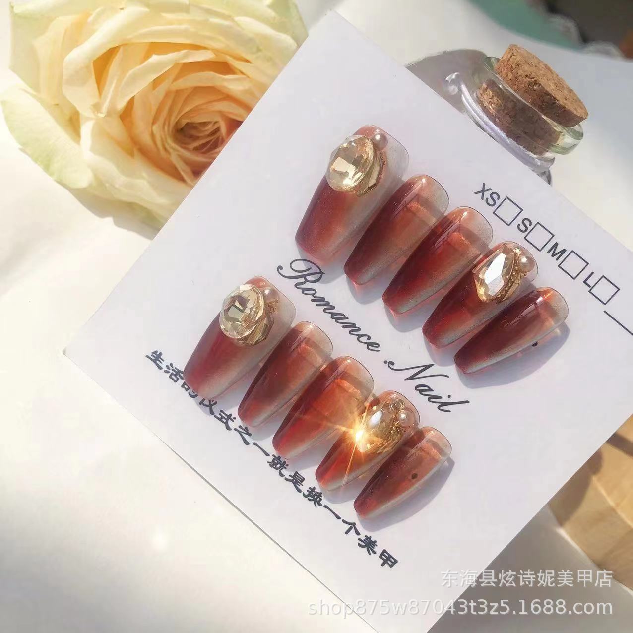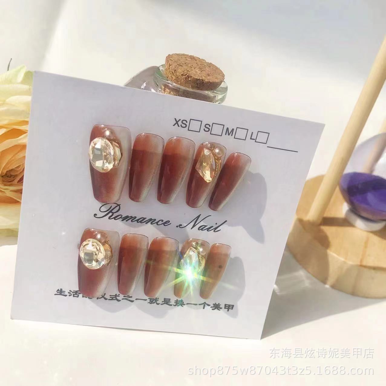 纯手工穿戴甲琥珀色贴钻猫眼光疗甲爆闪极光指甲片可拆卸重复使用
