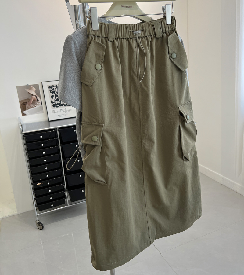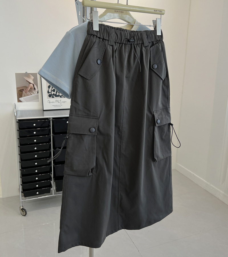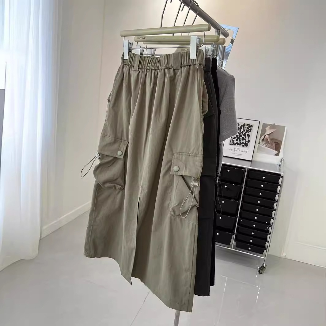 春夏新款韩版高腰复古工装半身裙女开叉显瘦A字裙宽松口袋中长裙