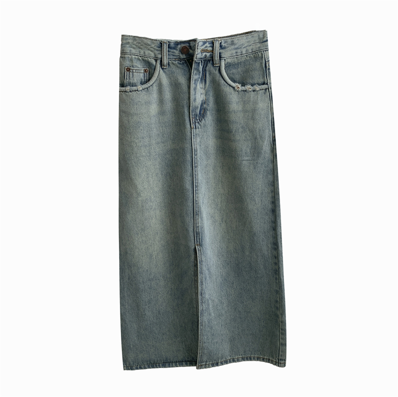 纯棉半身裙浅蓝色开叉牛仔裙女春夏显瘦复古高腰百搭包臀长裙