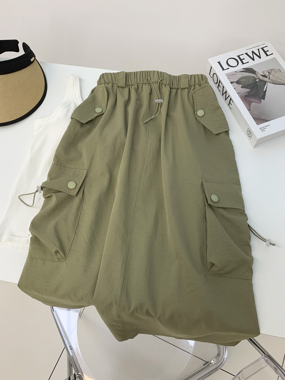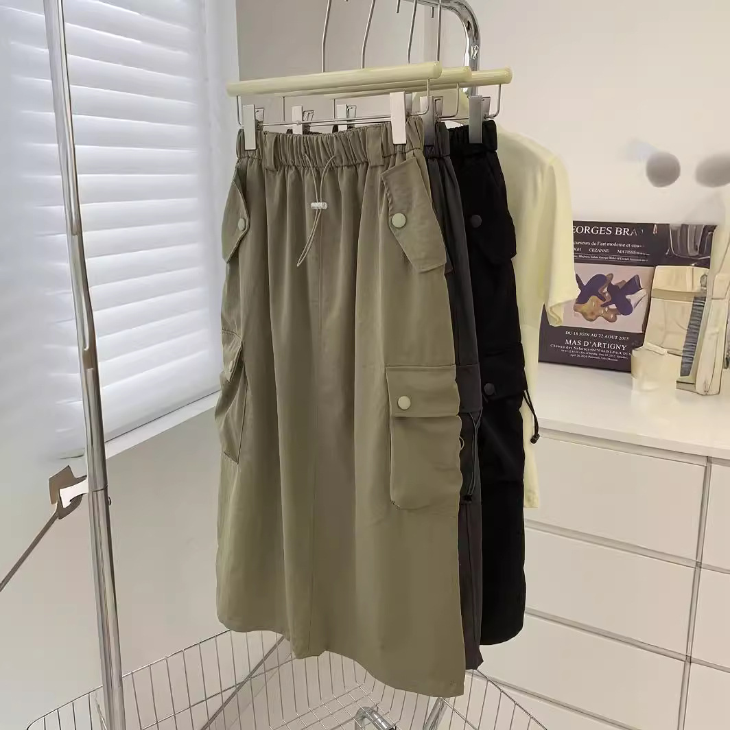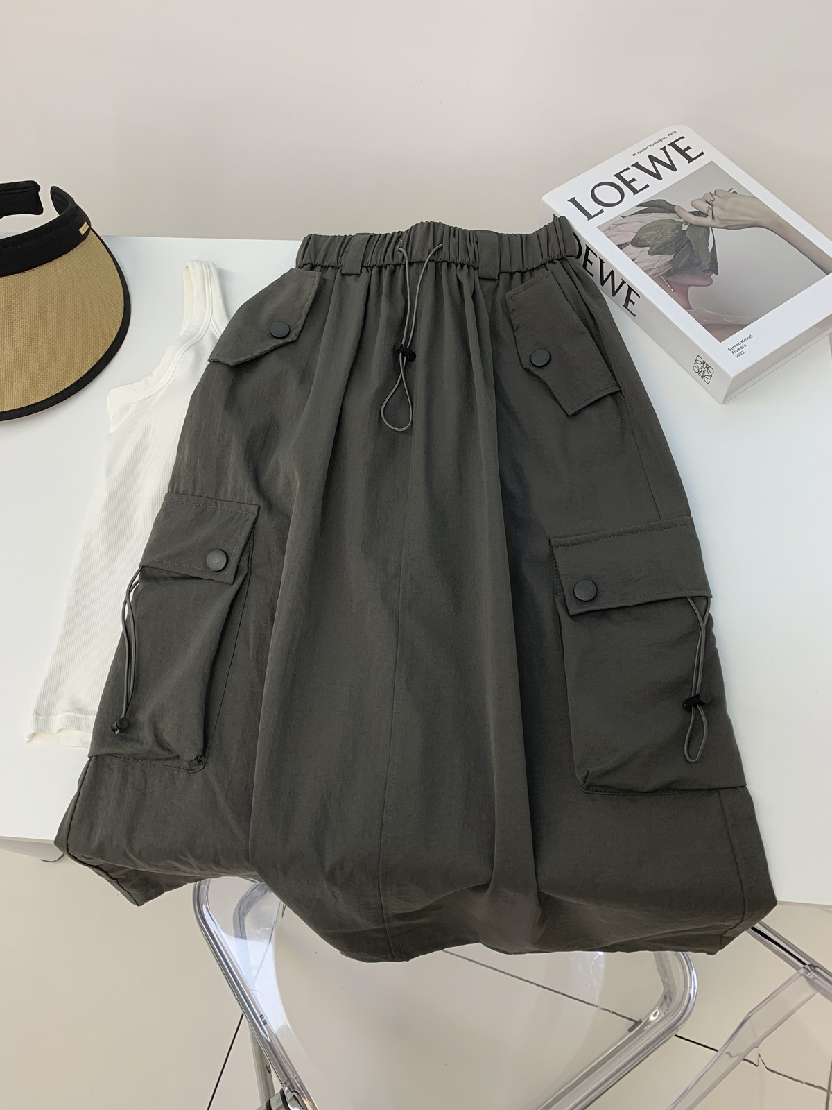 深灰色抽绳高腰工装半身裙女宽松时髦复古显瘦百搭直筒开叉裙子夏