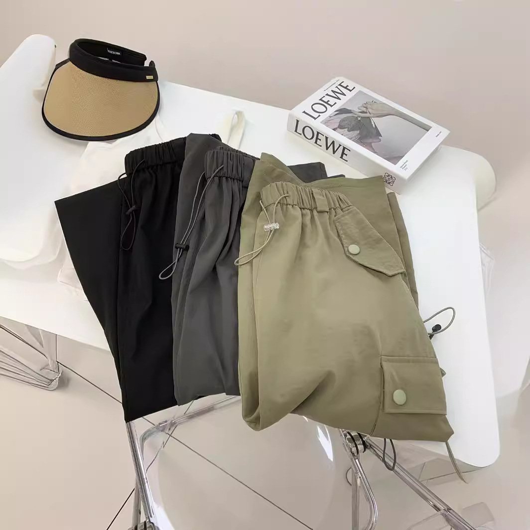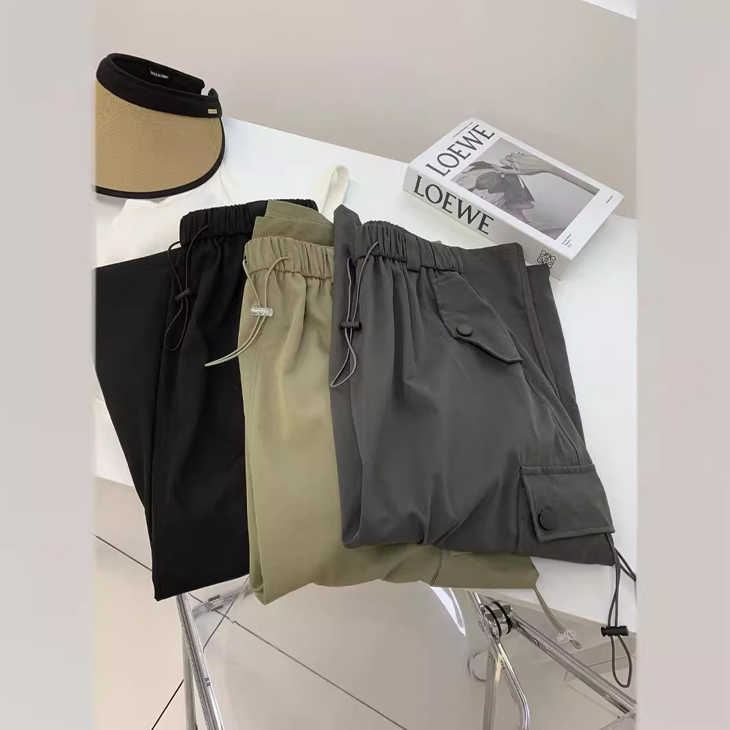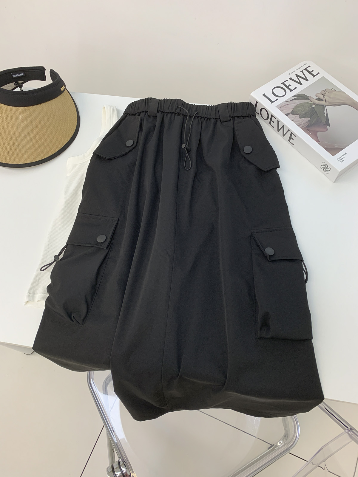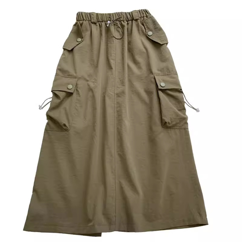深灰色抽绳高腰工装半身裙女宽松时髦复古显瘦百搭直筒开叉裙子夏