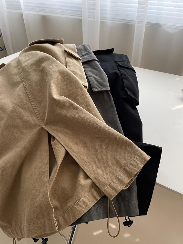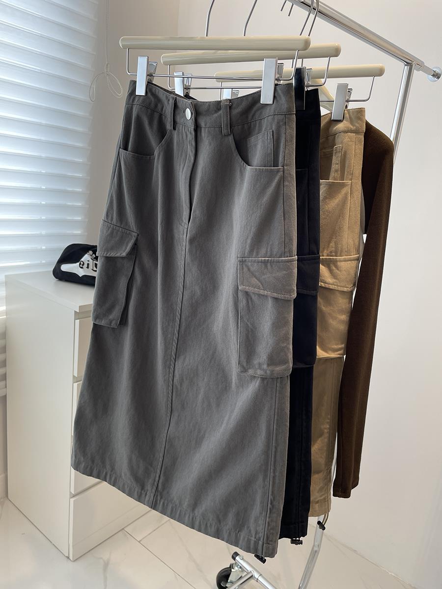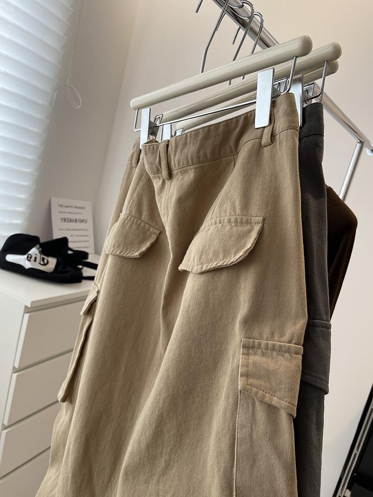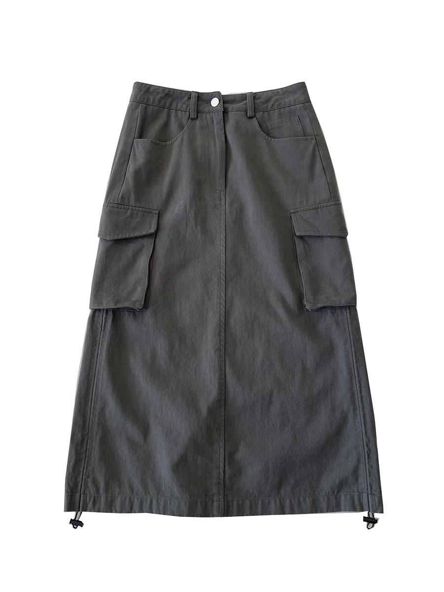美式复古口袋工装裙女高腰显瘦褶皱抽绳后开叉中长牛仔半身裙女潮