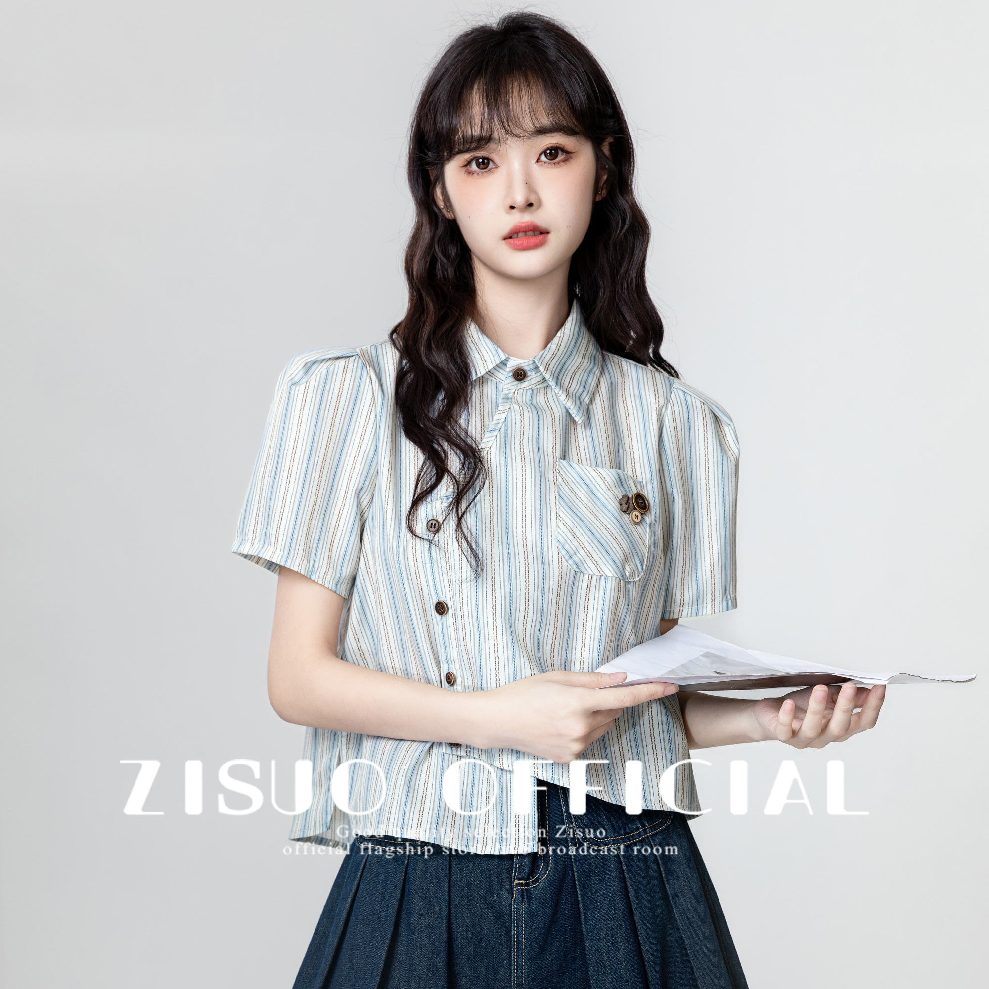 不规则条纹短袖衬衫女夏2025夏季新款学院风POLO领正肩衬衣短上衣