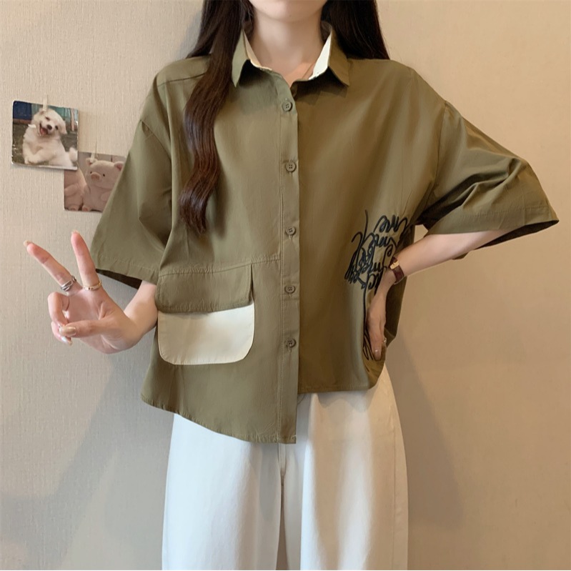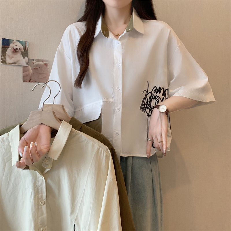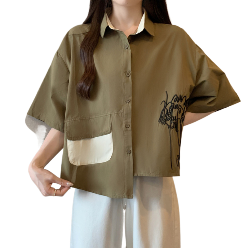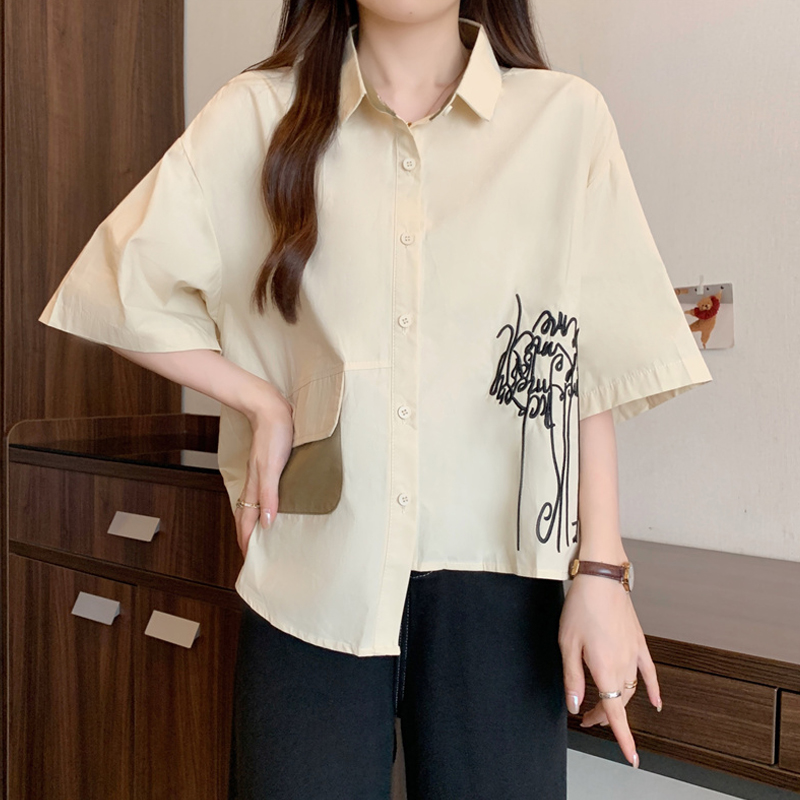 设计感不规则印花短袖衬衫女夏大码胖mm显瘦遮肚子POLO领半袖上衣