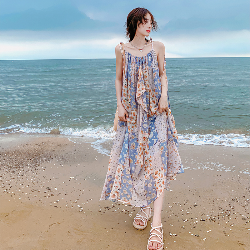 蓝色沙滩度假连衣裙三亚泰国海边雪纺吊带裙宽松夏季新款海岛裙子