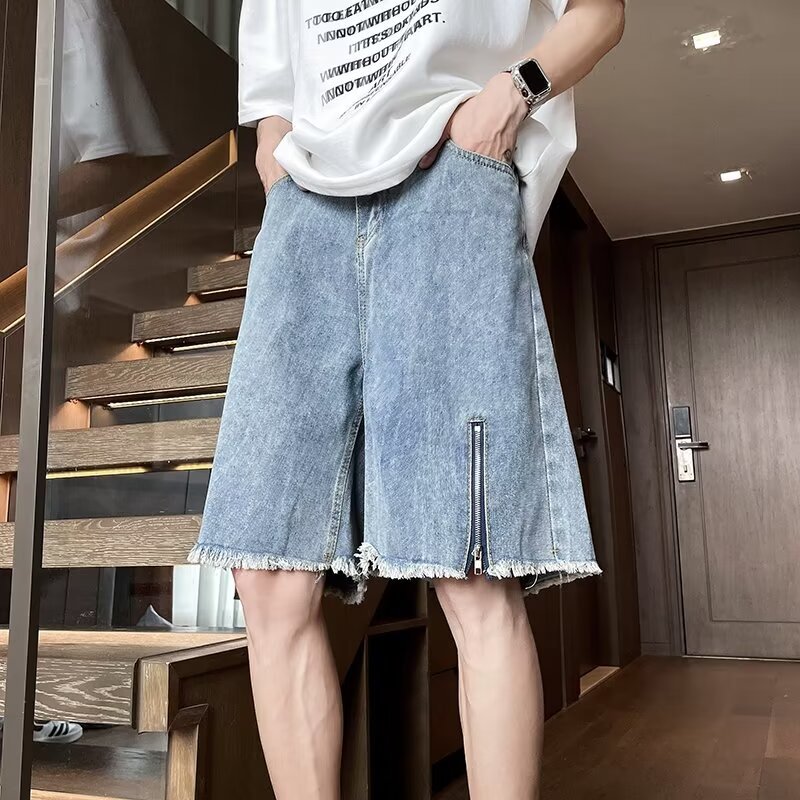 港风复古做旧毛边直筒牛仔短裤男潮牌夏季街头拉链宽松阔腿五分裤